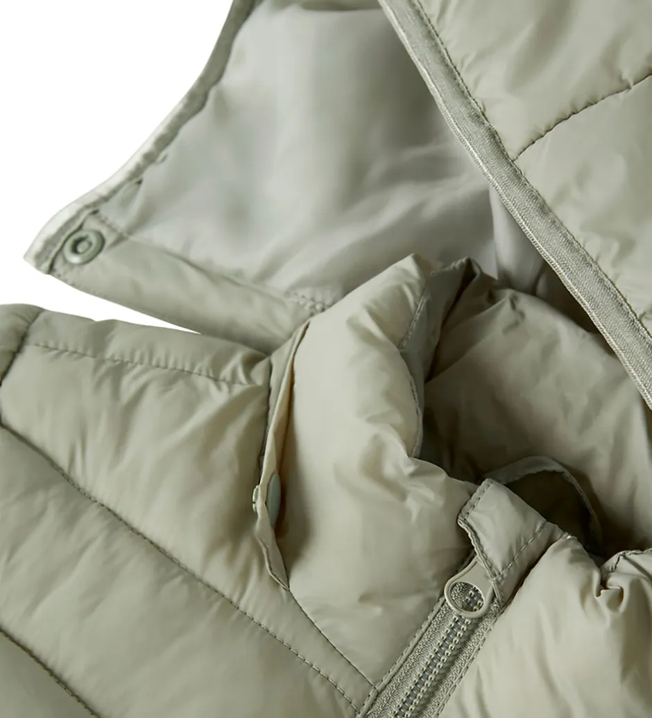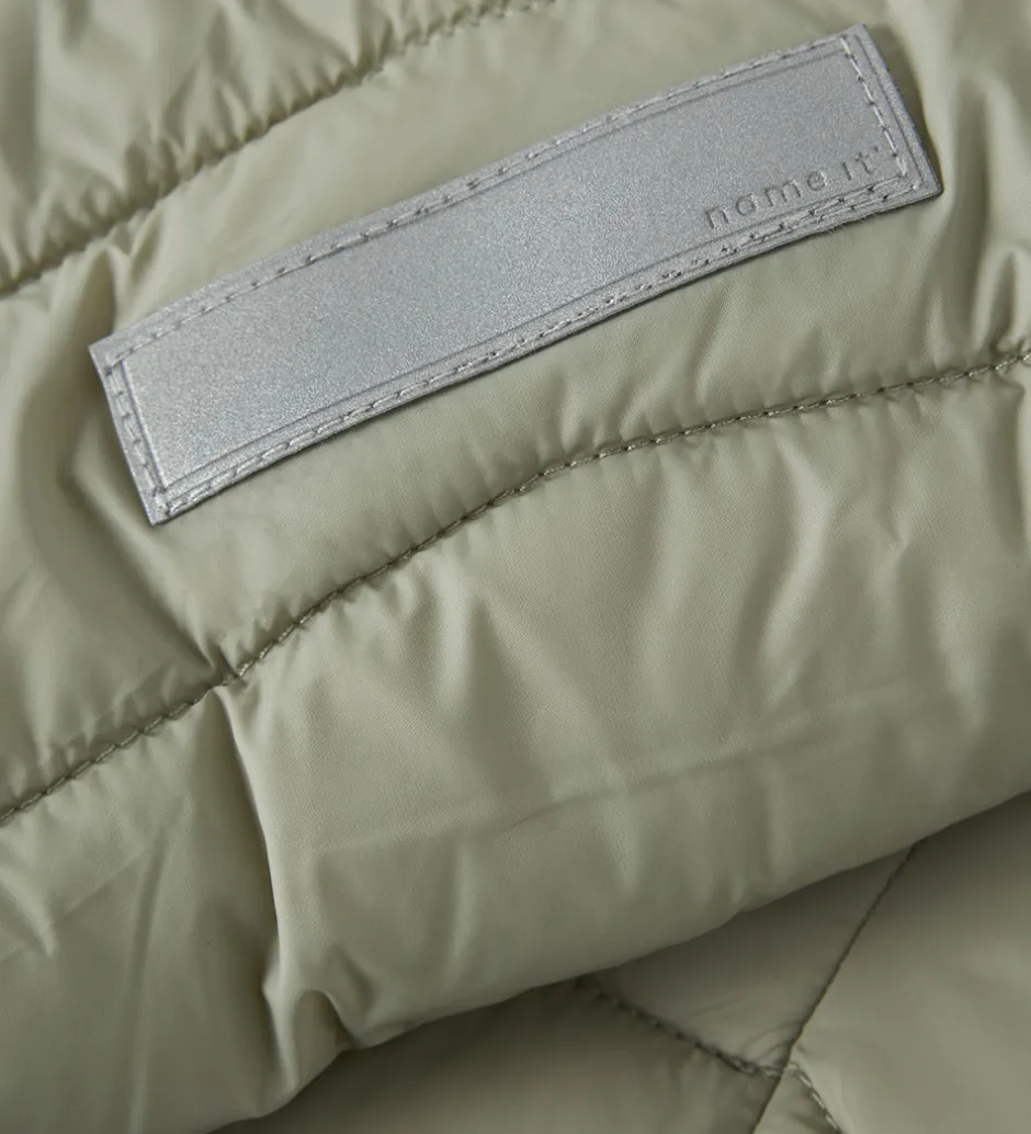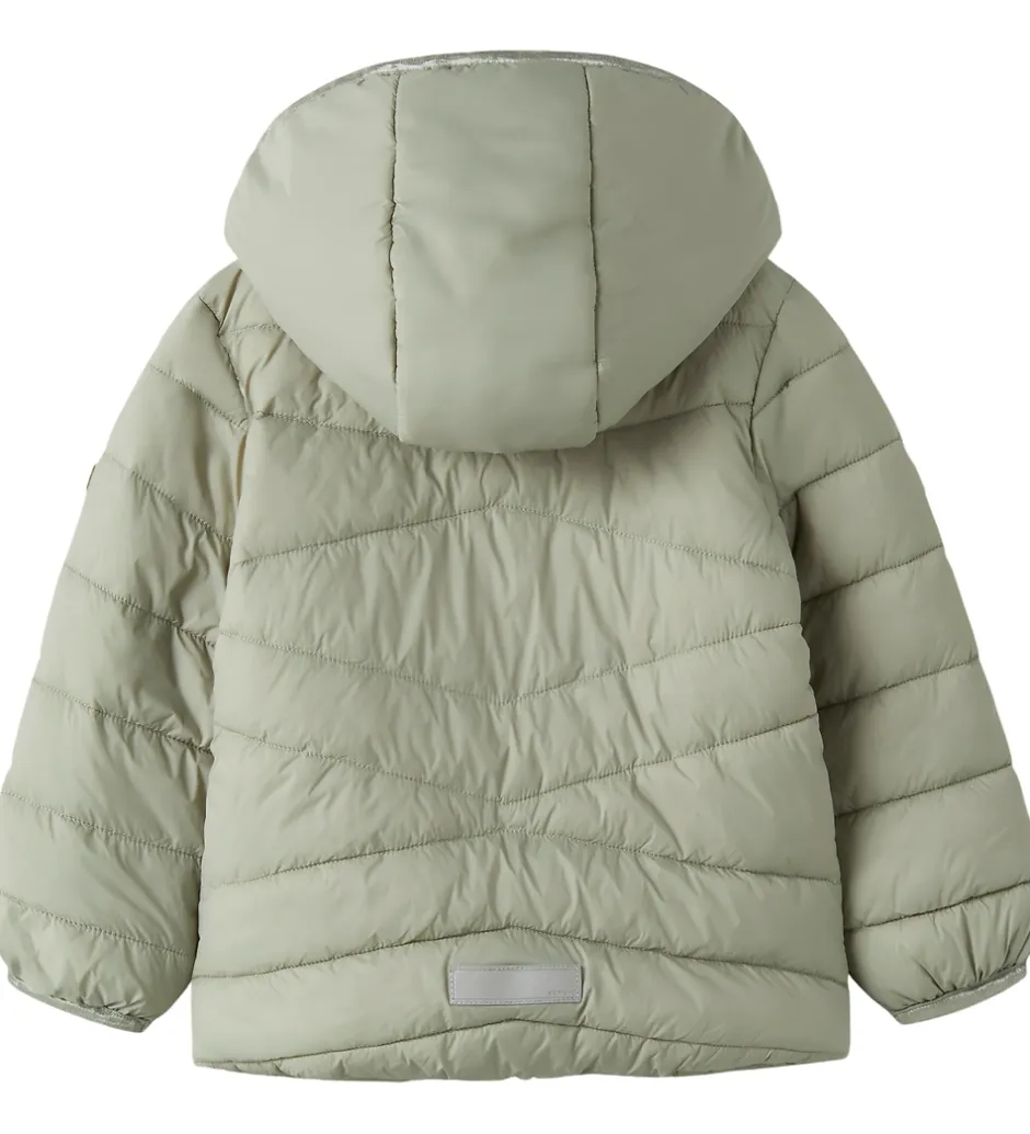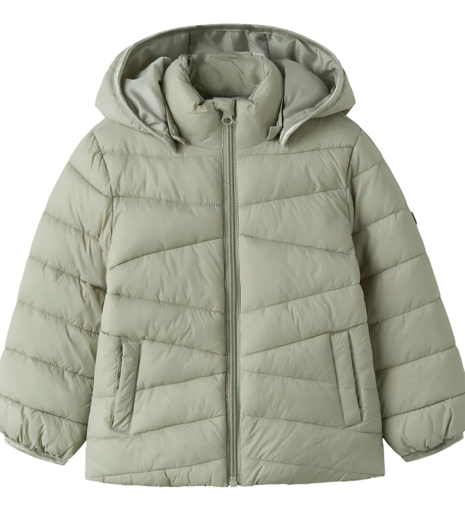 Praktisk Name It dynejakke i lys, støvet grøn, der giver et stilfuldt udtryk. Dynejakken har en aftagelig hætte og en gennemgående lynlås fortil, der sikrer nem lukning.