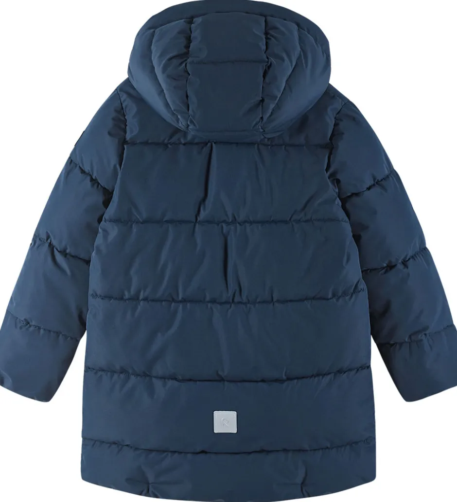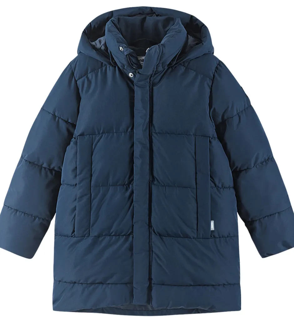 Reima dynejakken har en aftagelig hætte, som sidder fast med skjulte trykknapper omkring den høje halskrave, og ærmerne har praktiske elastikanter i åbningerne.