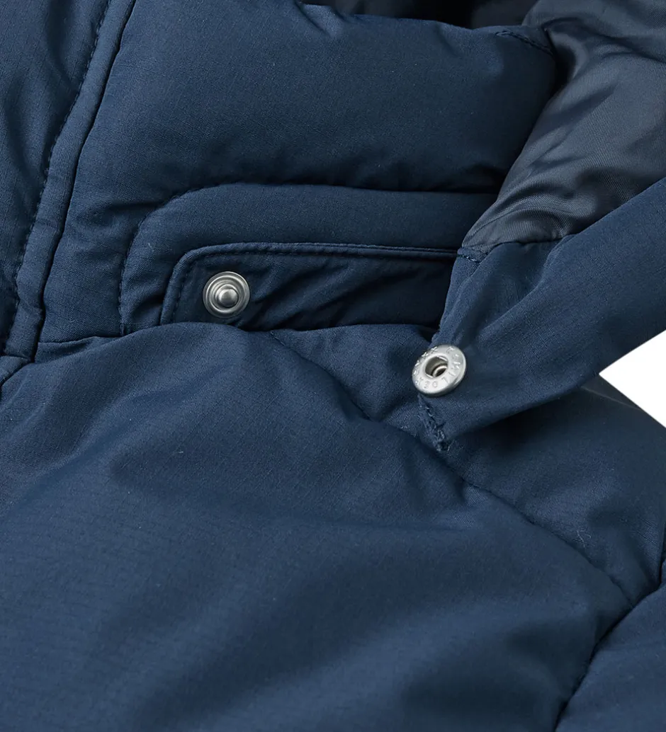 Dynejakken lukkes med en lynlås med hagebeskytter og dobbelt vindstolpe, hvoraf den udvendige lukkes til med trykknapper. Fortil er der to vertikale lynlåslommer, der skjules af en fold. I livåbningen har dynejakken også elastikkant.