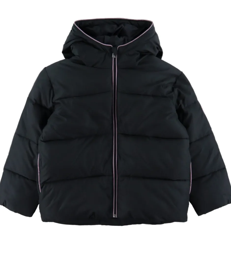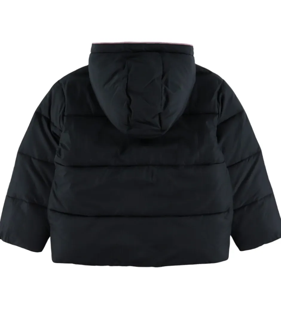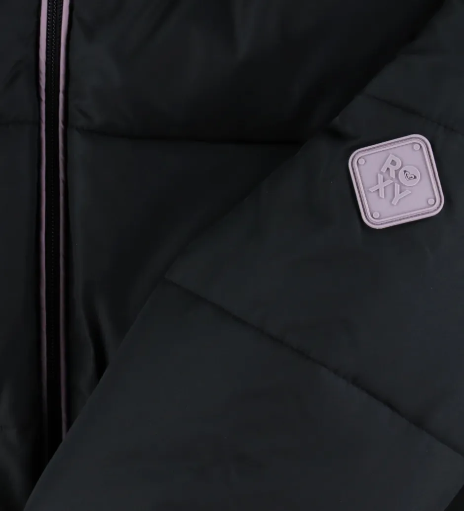 Skøn Roxy dynejakke i sort med vandrette syninger samt lilla detaljer i form af pipings og en gummilogo-applikation på venstre overarm.