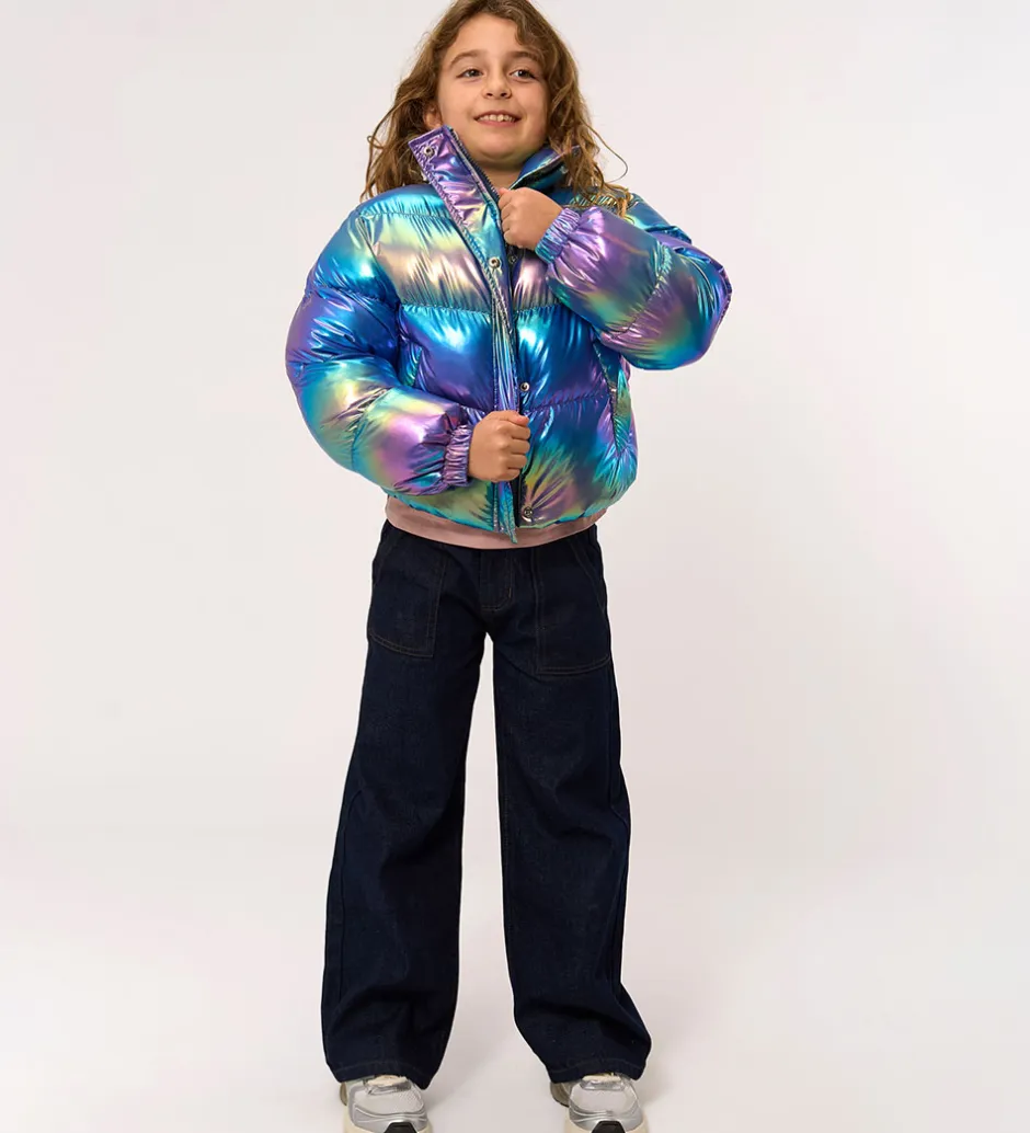 Lækker The New dynejakke skinnende og nuanceret design med changerende farver i lilla, blå, grøn og guld. Dynejakken har vandrette syninger.
