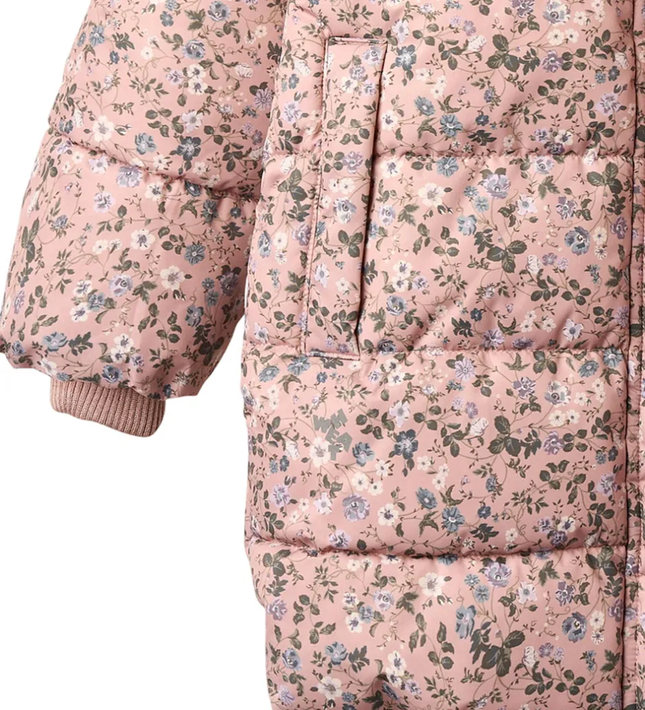 Lækker Wheat dynejakke i rosa med et alloverblomsterprint i lilla, blå, hvide og grønne farver. Dynejakken har vandrette syninger.