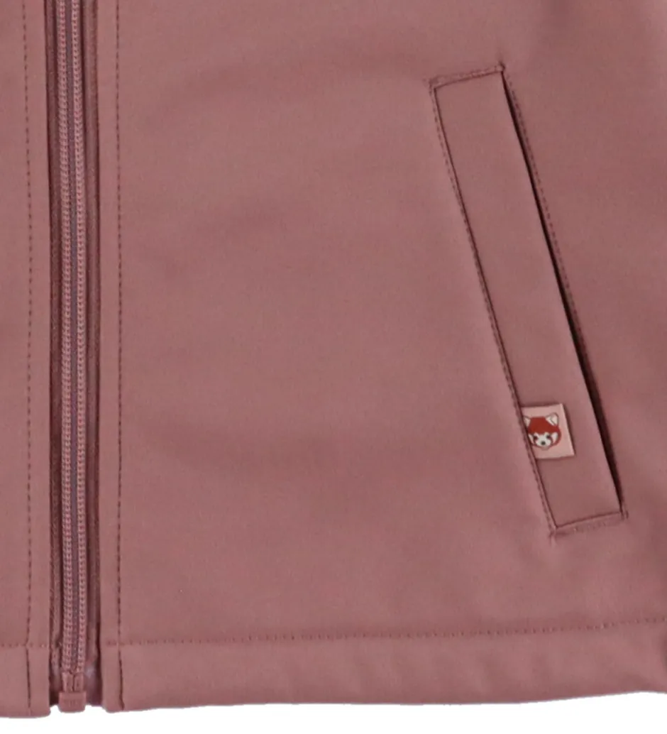 Fin DYR-Cph softshelljakke i støvet rosa med et stort print af en rød panda på ryggen.