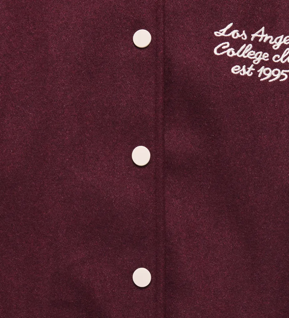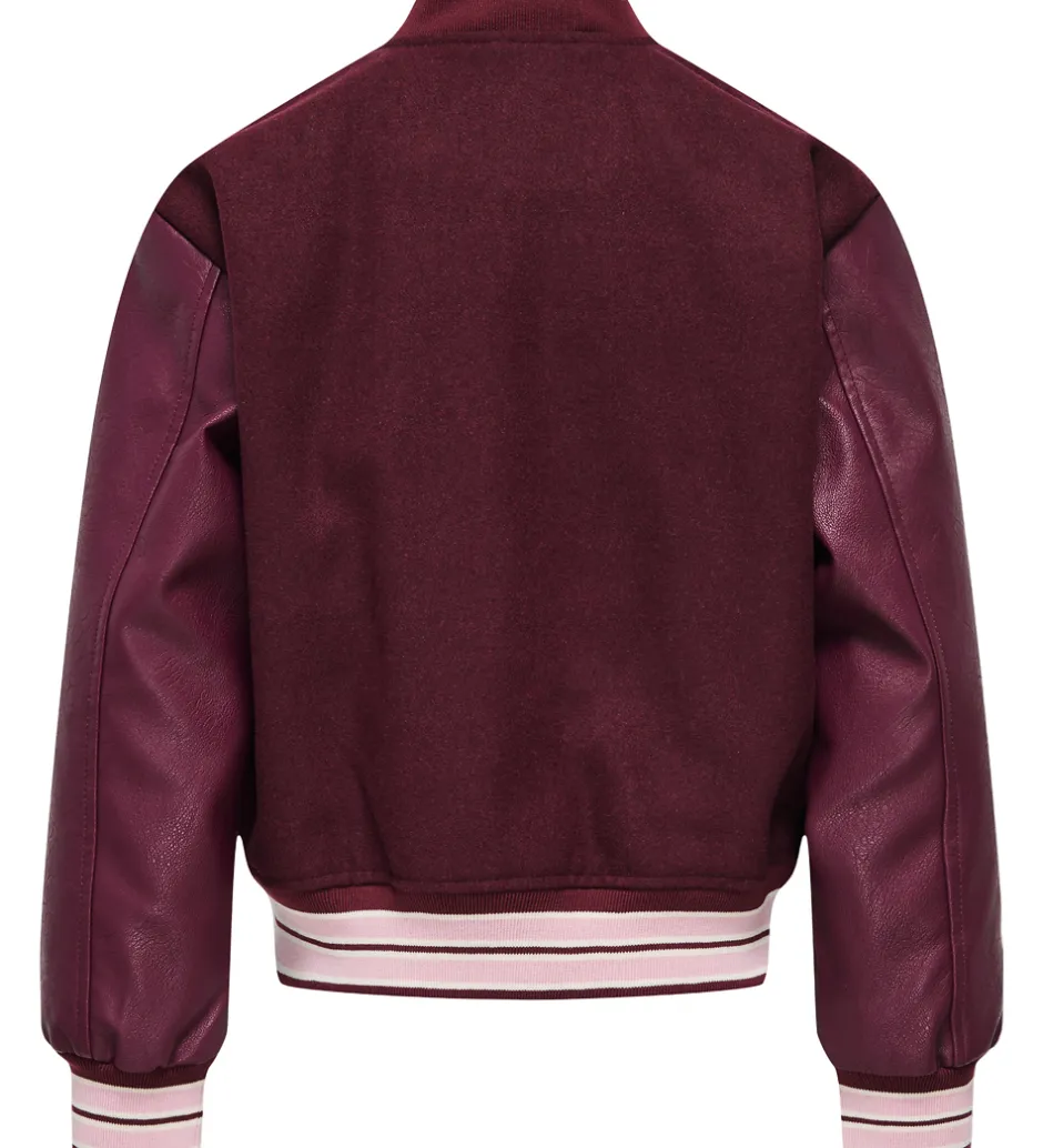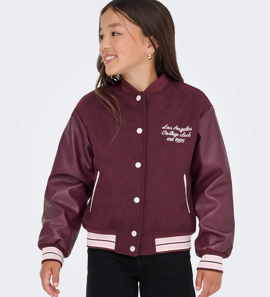 Stilfuld Kids Only bomberjakke i en dyb bordeaux nuance. Bomberjakken har flotte ærmer i læderlook og et broderet “Los Angeles College Club est. 1995” broderi på brystet, som tilføjer et sporty look. Kids Only leverer kvalitet og komfort i hver detalje.