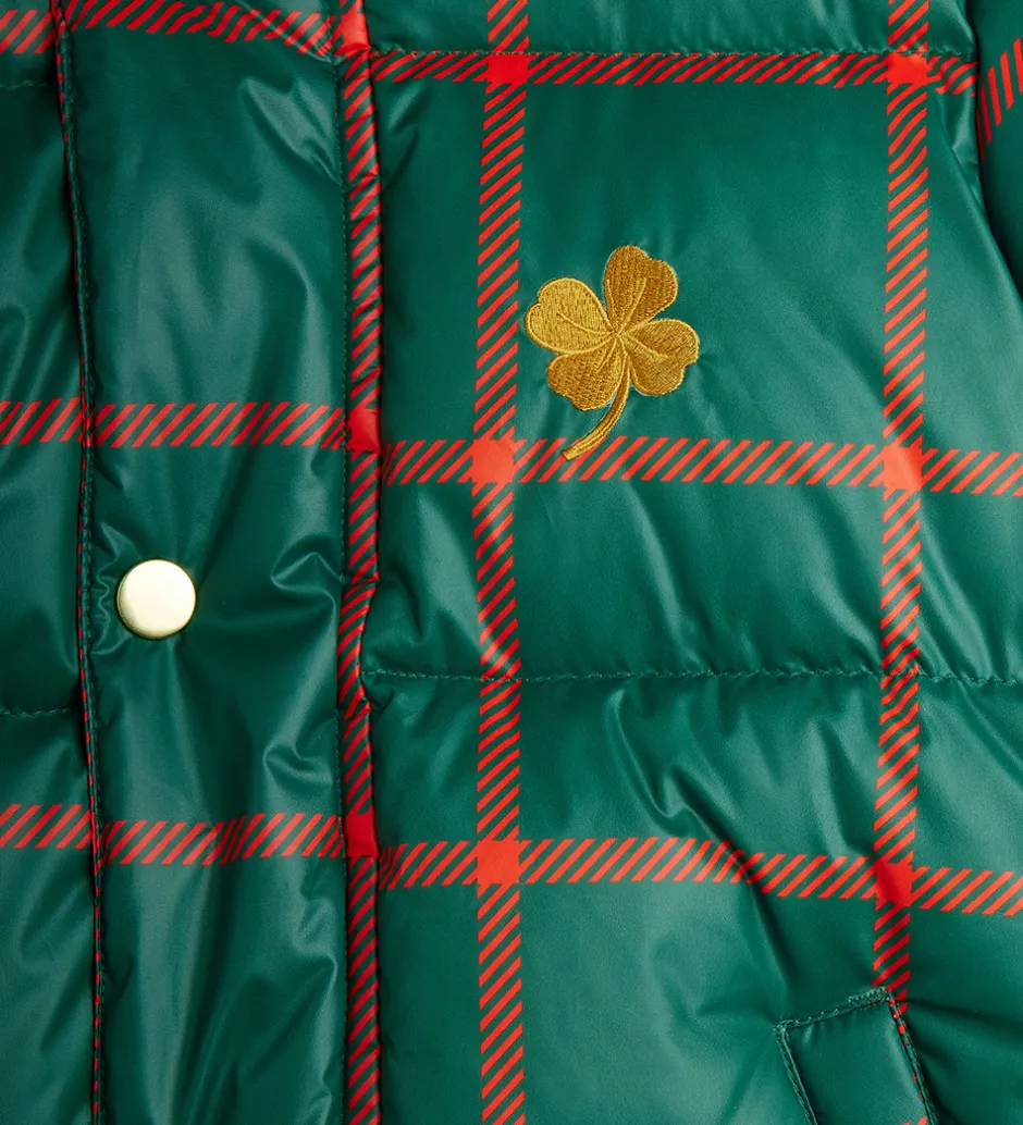 Elegant Mini Rodini dynejakke i en flot kombination af grøn med et iøjnefaldende rødt ternet mønster.