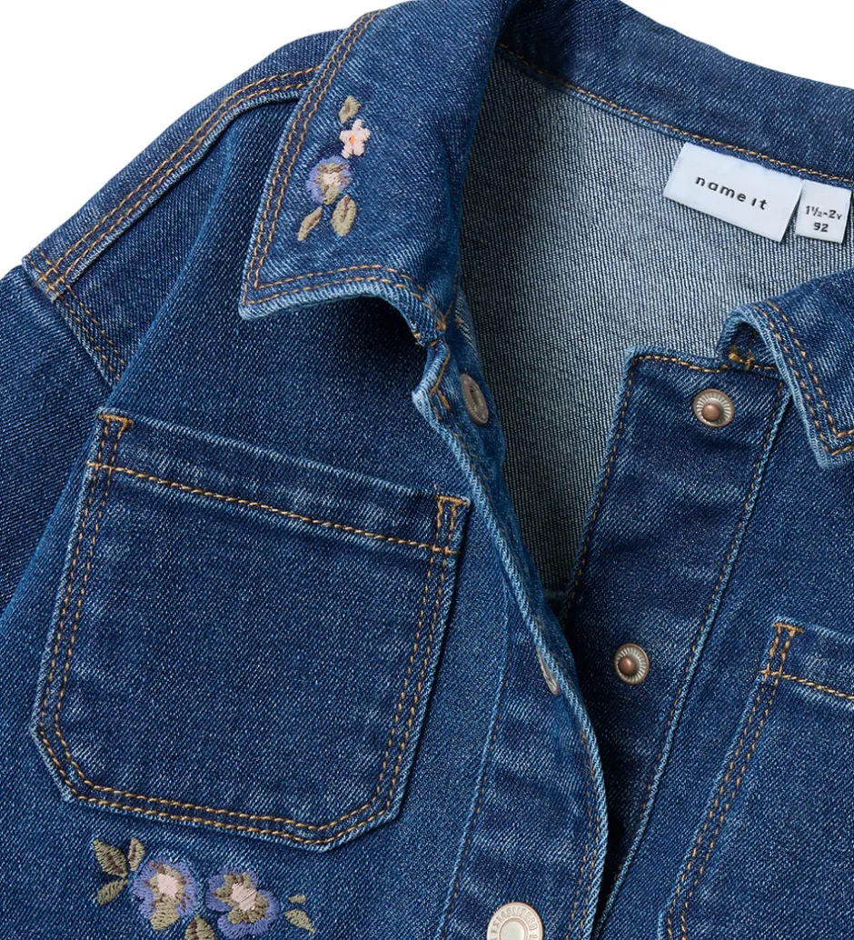 Flot Name It denimjakke i blå med broderede blomsterdetaljer i fine farver. Denimjakken har en traditionel krave og lukkes med gennemgående trykknapper foran. Den har lange ærmer og manchetter med en trykknap. Fortil er der praktiske brystlommer, og nederst har den en buet facon, hvilket giver en flot effekt.