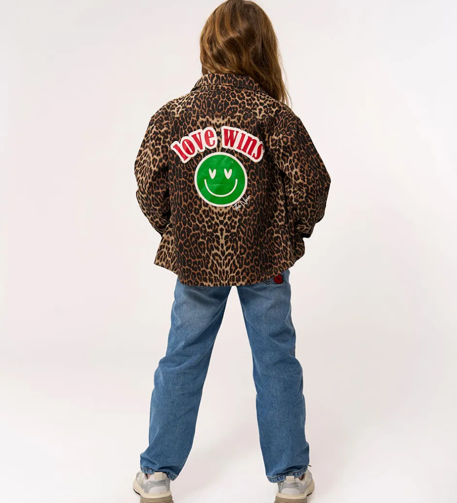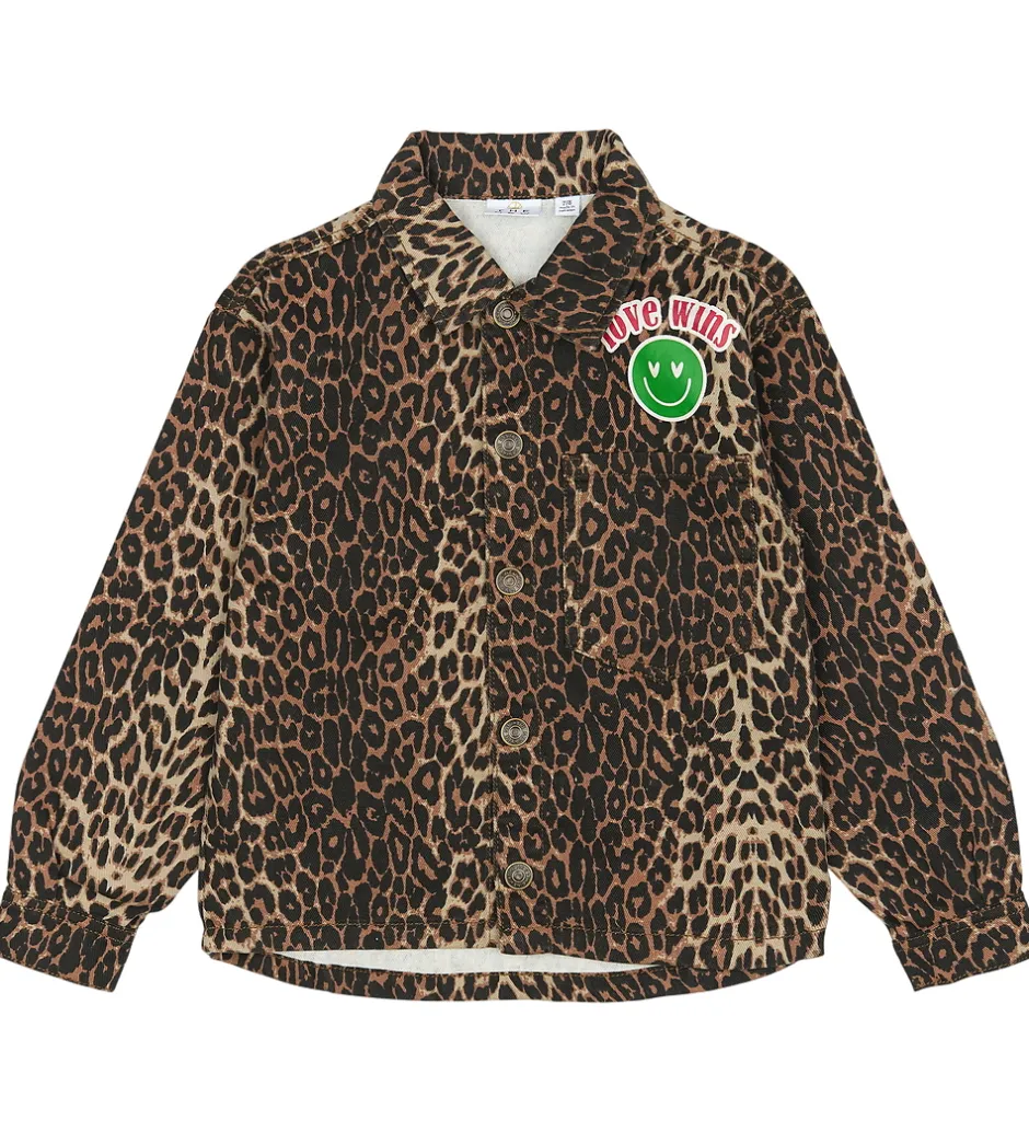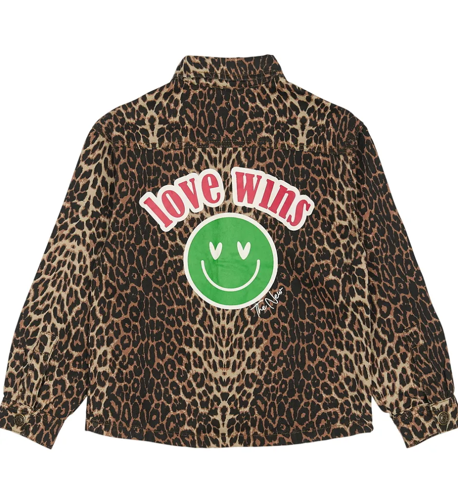 Cool overshirt fra The New i twilldenim og med et allover leopardmønster i varme nuancer. Overshirten fra The New har et flot print over den åbne brystlomme med en smiley og ordene “love wins”. Samme print er i et større format på ryggen. Overshirten har en gennemgående lukning fortil med trykknapper, og ærmerne afsluttes med slids og lukning med trykknap.