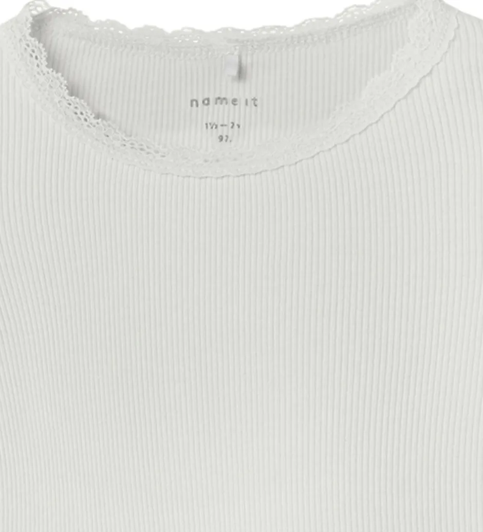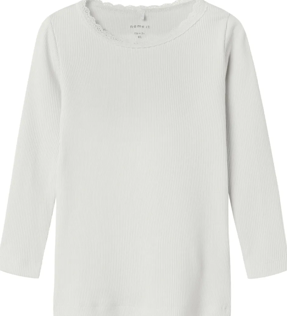Fin Name It bluse i hvid med ribstruktur. Blusen har en rund halsudskæring med en fin blondekant og lange ærmer.