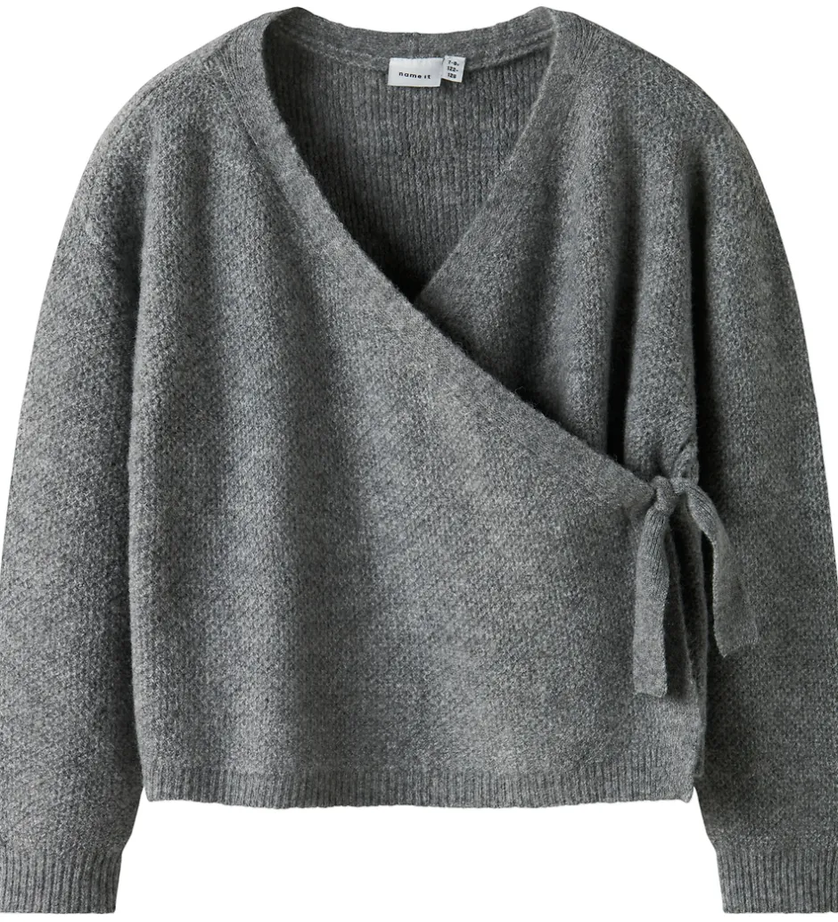 Elegant Name It bluse i grå strik med flot struktur. Blusen har et smart slå-om design med bindebånd. Blusen har lange ærmer og ribkanter ved alle åbninger.