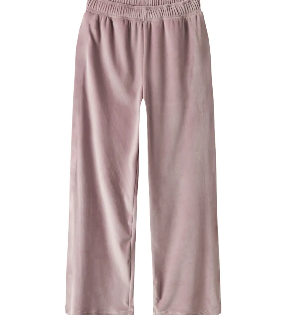 Flotte velourbukser fra Name It i rosa. Bukserne har en god elastik i taljen, som kan justeres med knapper indvendigt. De har en afslappet pasform med lige ben.