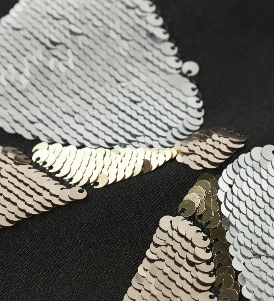 Elegant Name It bluse i sort med lange ærmer. Blusen har et dekorativt palietmønster på forsiden, som danner en sløjfe i nuancer af sølv og guld. Blusen har en rund halsudskæring med en smal ribkant.