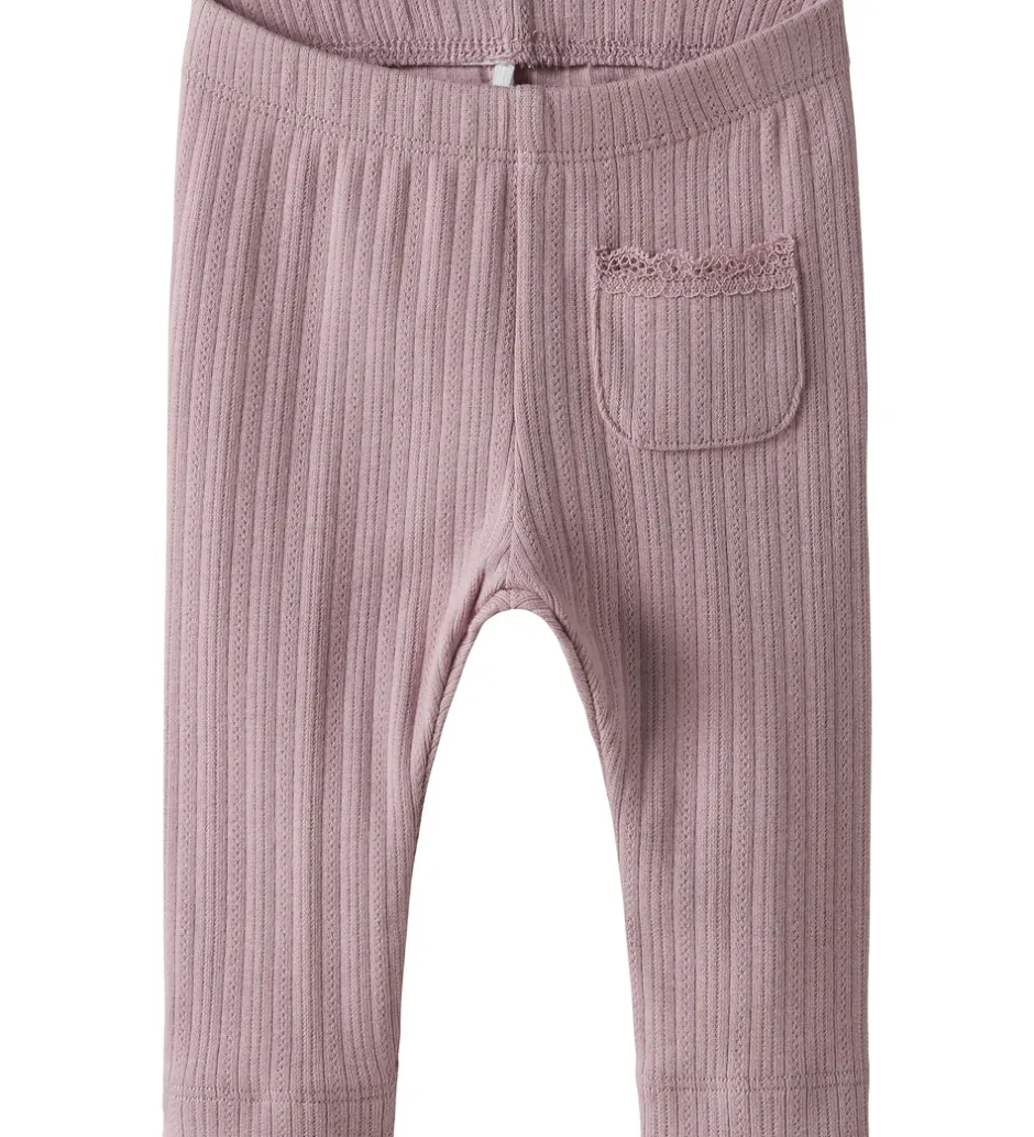 Fine Name It leggings i en støvet, rosa nuance med en dekorativ ribstruktur og hulmønster. Name It leggingsene har en elastisk talje og en lille lomme med blondekant på fronten.