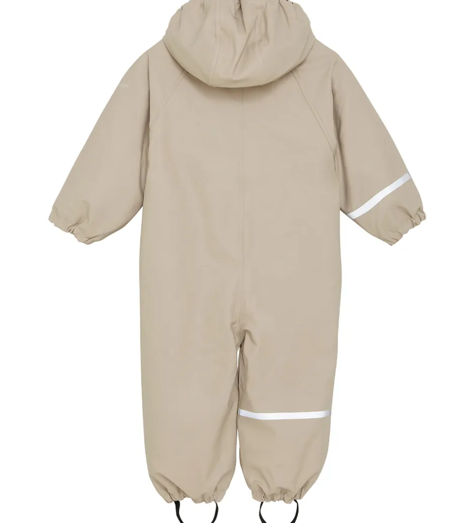 Lækker CeLaVi regndragt i beige med en refleksstribe rundt om højre ærme og højre ben og et reflekslogo på venstre ærme og på hætten.