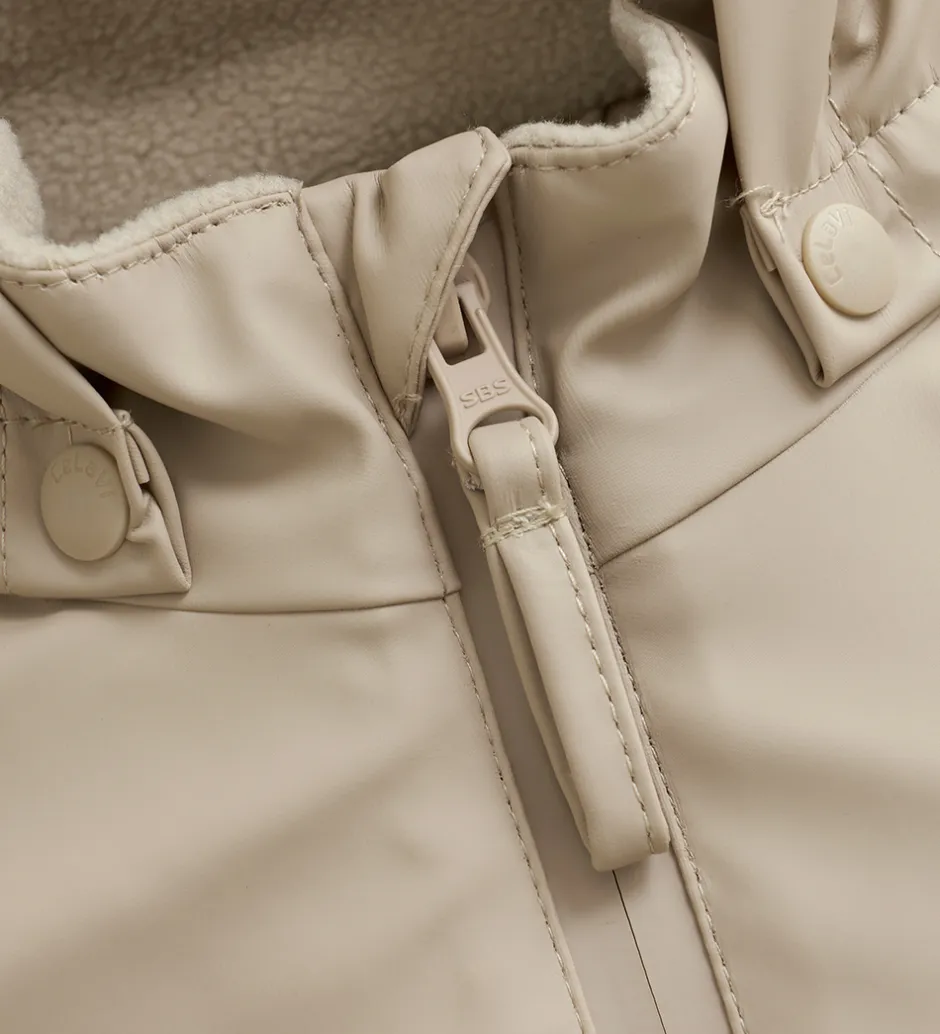 CeLaVi regndragten åbnes fortil med lynlås med hagebeskytter og indvendig vindstolpe. Indvendigt er der blødt fleecefor.