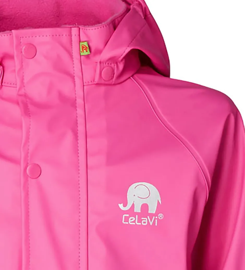 CeLaVi regnjakken har en aftagelig hætte, som sidder fast med trykknapper. I toppen af hætten er der en elastikkant, og i halsåbningen er der blødt fleece. Ærmerne har smalle elastikkanter, som kan strammes ind med velcro. I bunden af jakken er der elastikkanter i siderne. Regnjakken åbnes med den lynlås med udvendig vindstolpe, som lukkes med trykknapper.