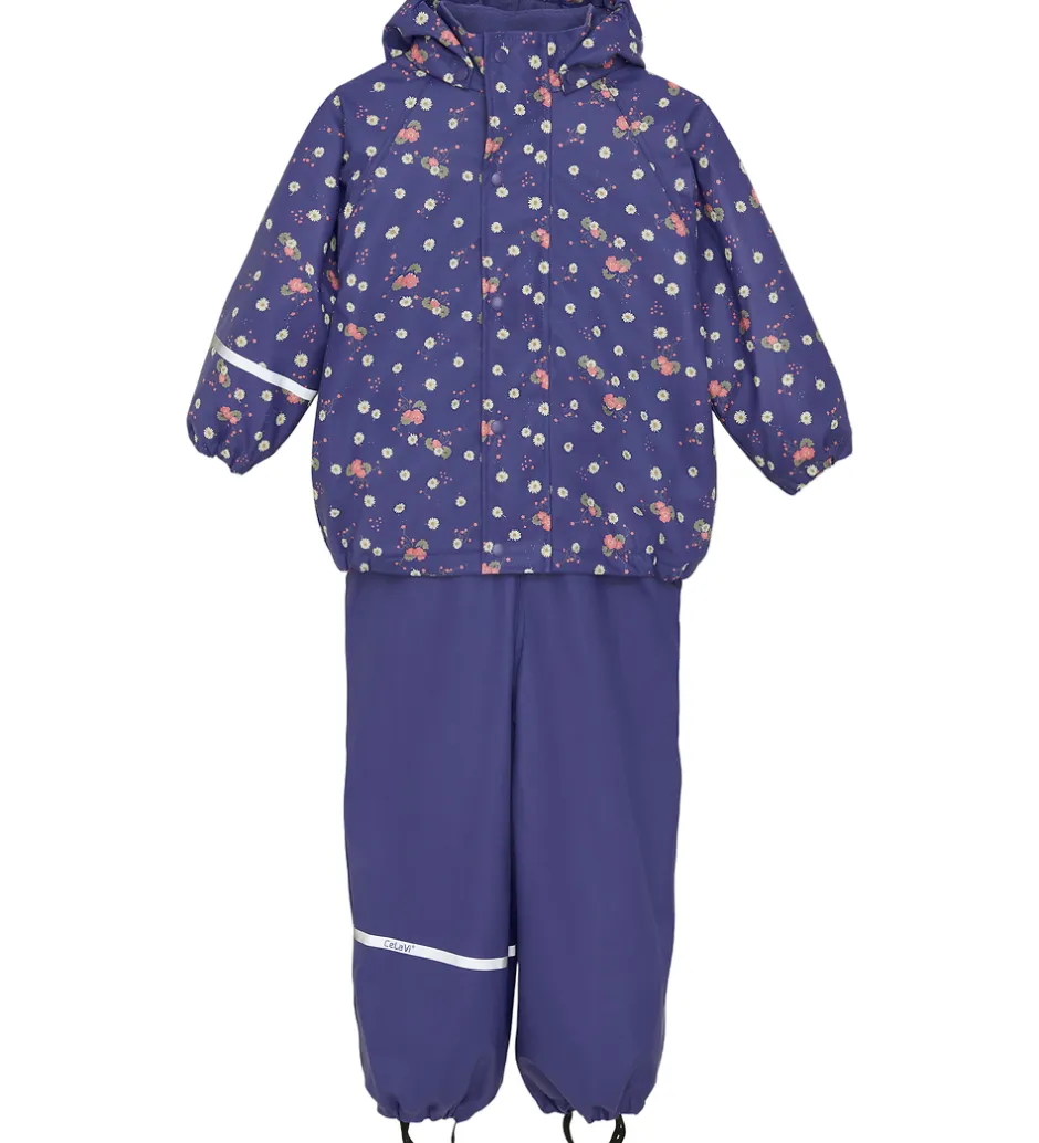 Skønt CeLaVi regntøj af PU i mørkeblå og med blomsterprint, bestående af en regnjakke og et par regnbukser med seler. Regntøjet er forsynet med praktiske reflekser.