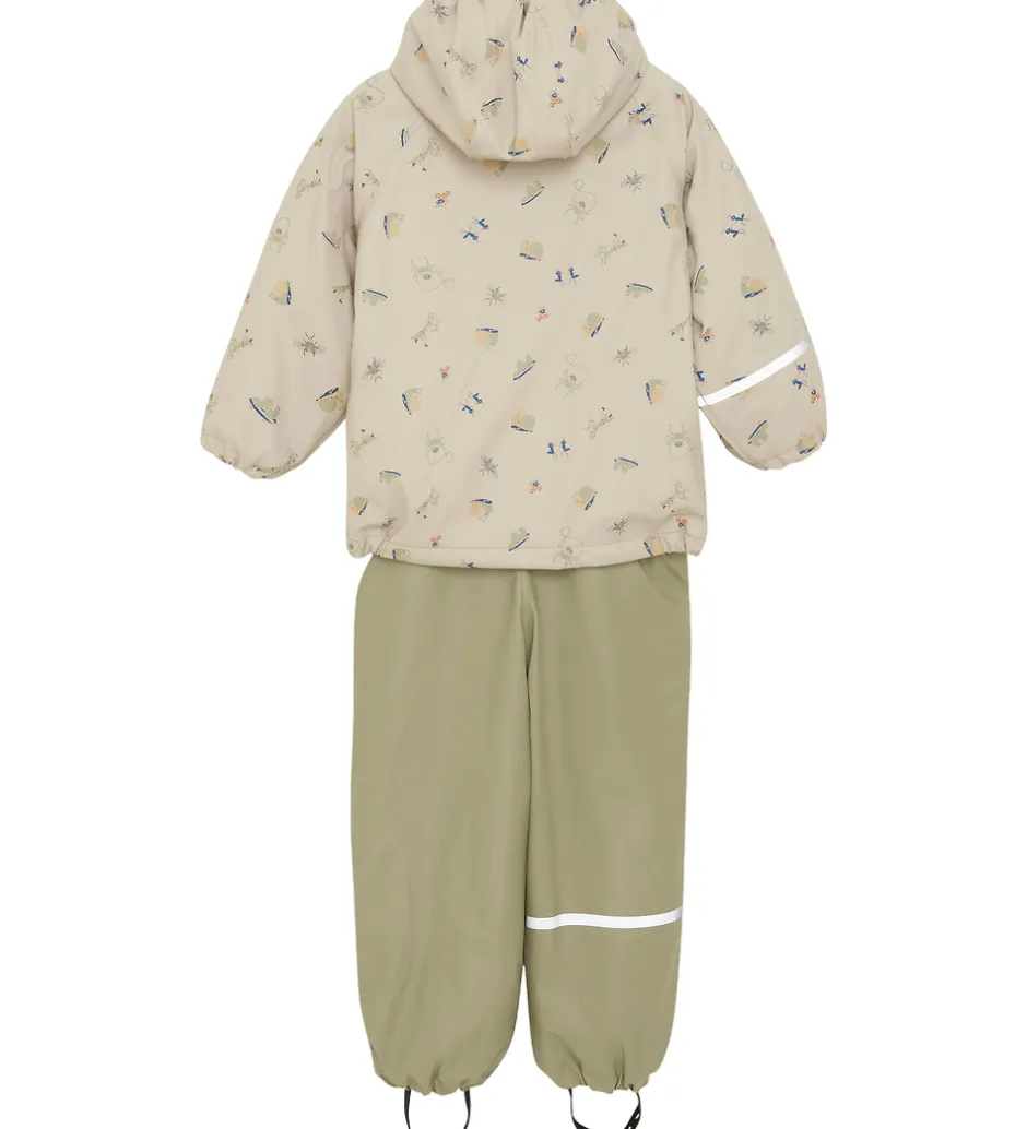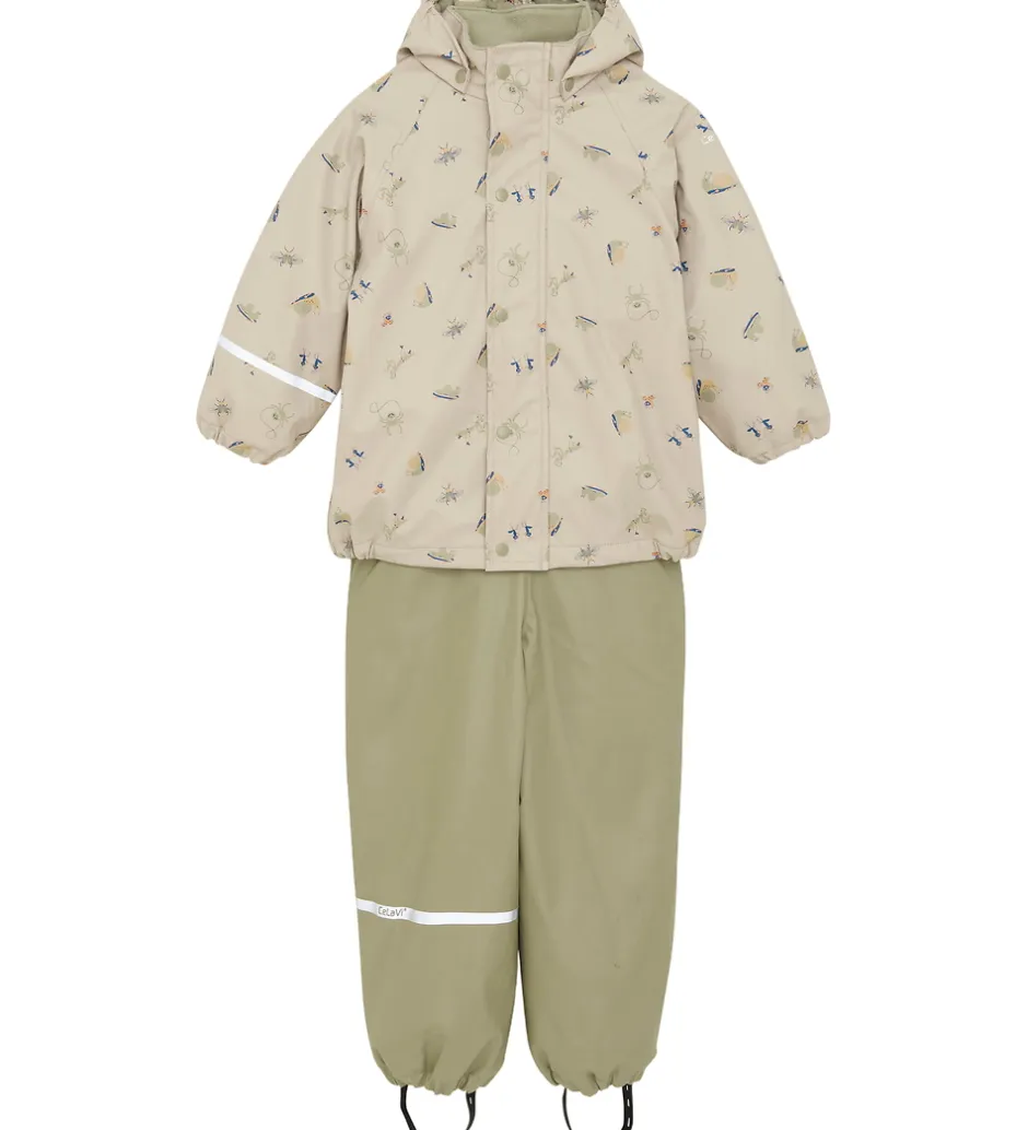 Skønt CeLaVi regntøj af PU, bestående af en regnjakke, der er beige med print af seje insekter, og et par regnbukser med seler i støvet gørn. Regntøjet er forsynet med praktiske reflekser.