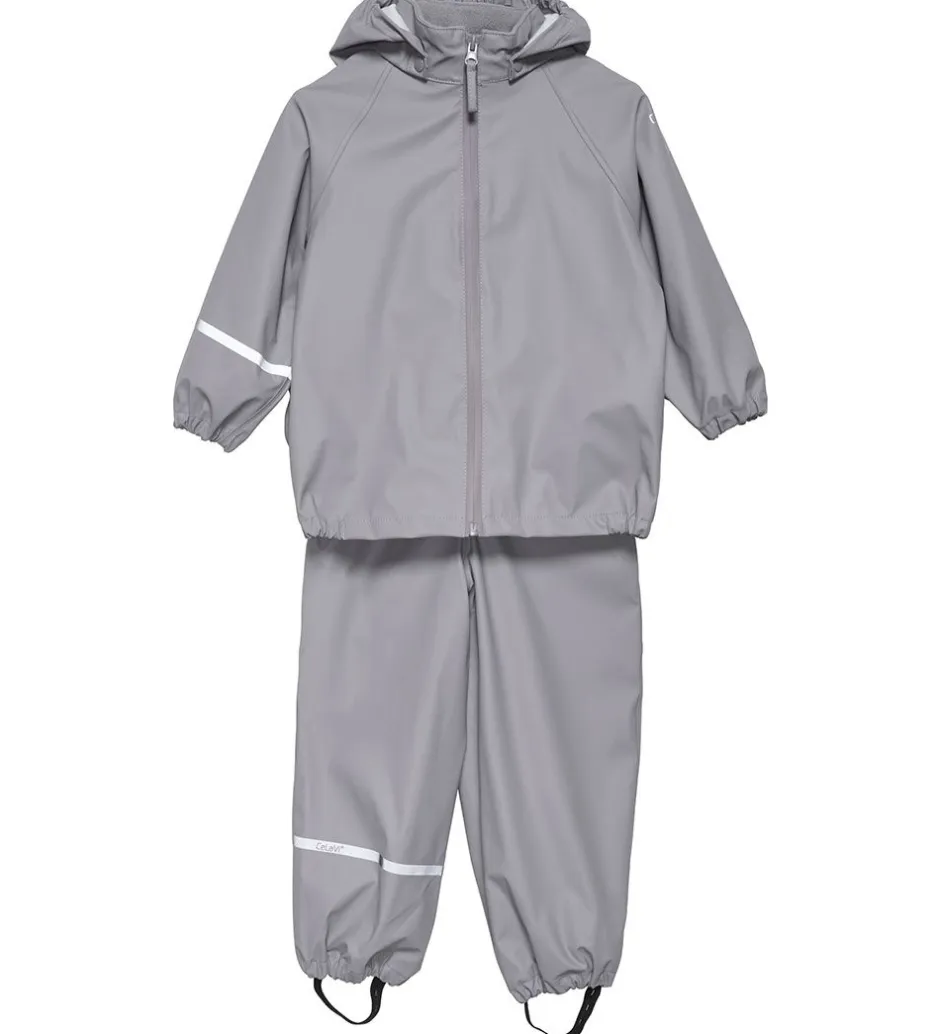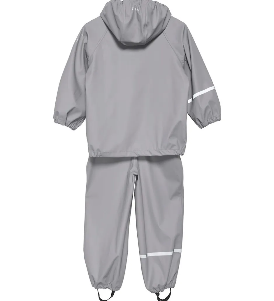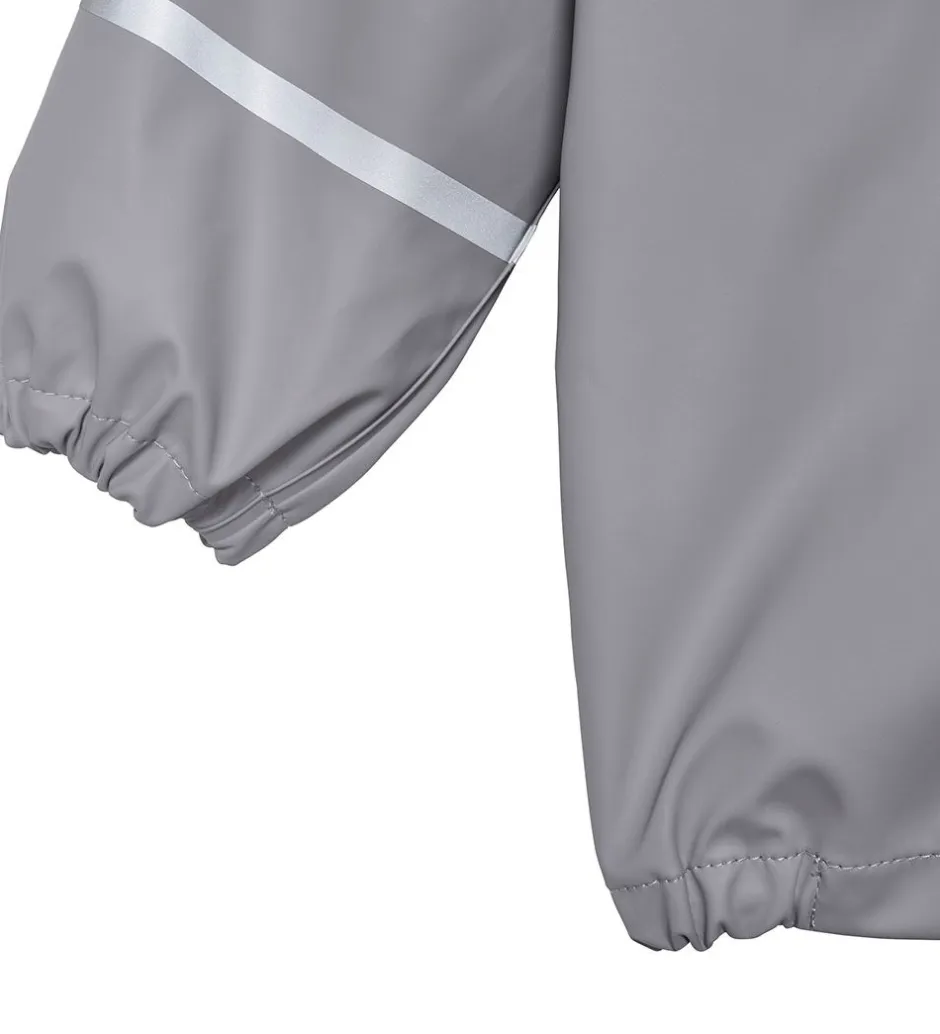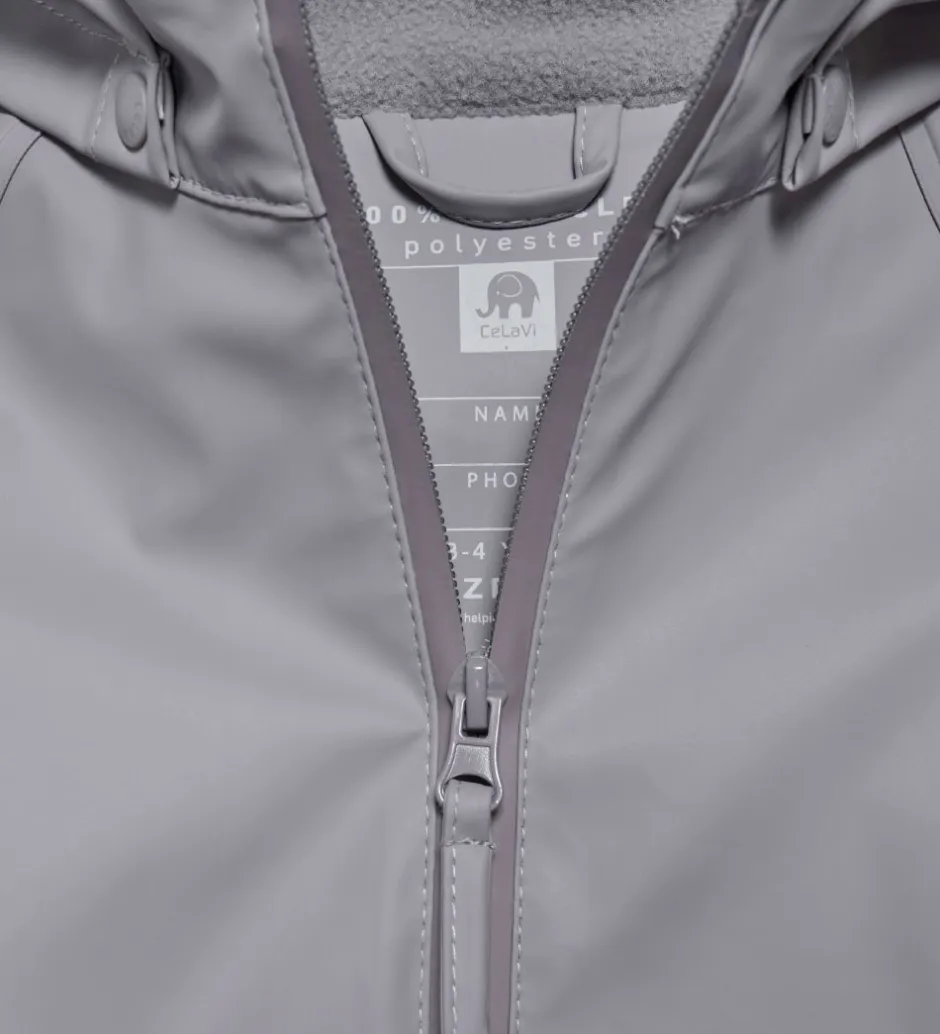Klassisk CeLaVi regntøj, der består af en regnjakke og et par regnbukser i grå.
