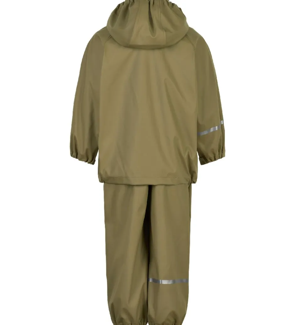Regntøjet har smalle refleksstriber rundt om højre ærme og højre bukseben, og øverst på venstre ærme og på hætten er der er et refleksprint.