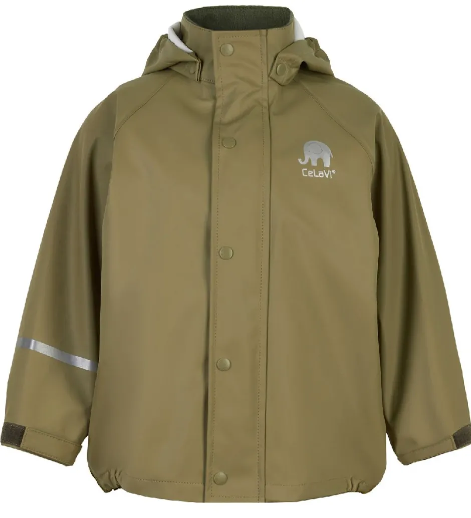 CeLaVi regnjakken har en aftagelig hætte, som sidder fast med trykknapper. I toppen af hætten er der en elastikkant, og i halsåbningen er der blødt fleece. Ærmerne har smalle elastikkanter, som kan strammes ind med velcro. I bunden af jakken er der elastikkanter i siderne. Regnjakken åbnes med den lynlås med udvendig vindstolpe, som lukkes med trykknapper.