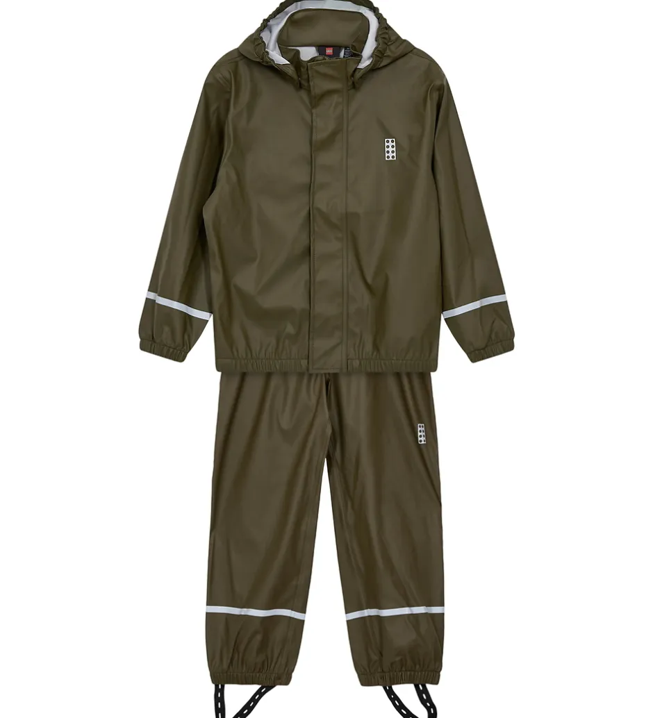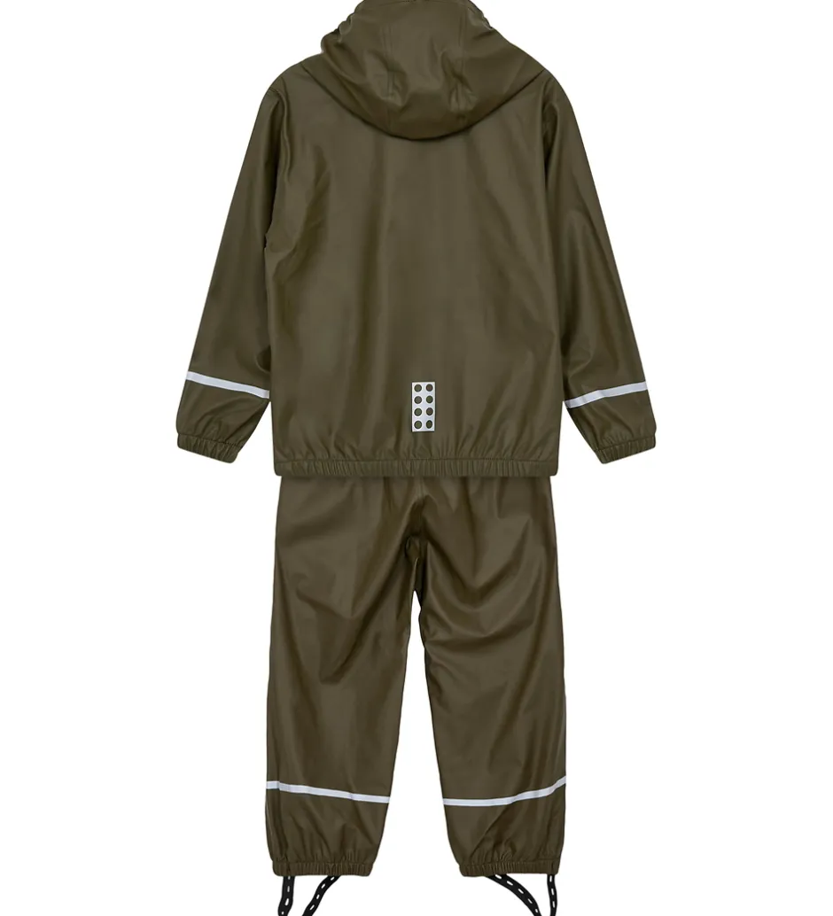 Smart LEGO® Wear regntøj i mørk khakigrøn bestående af en regnjakke og et par regnbukser. Regntøjet er med velplacerede reflekser.