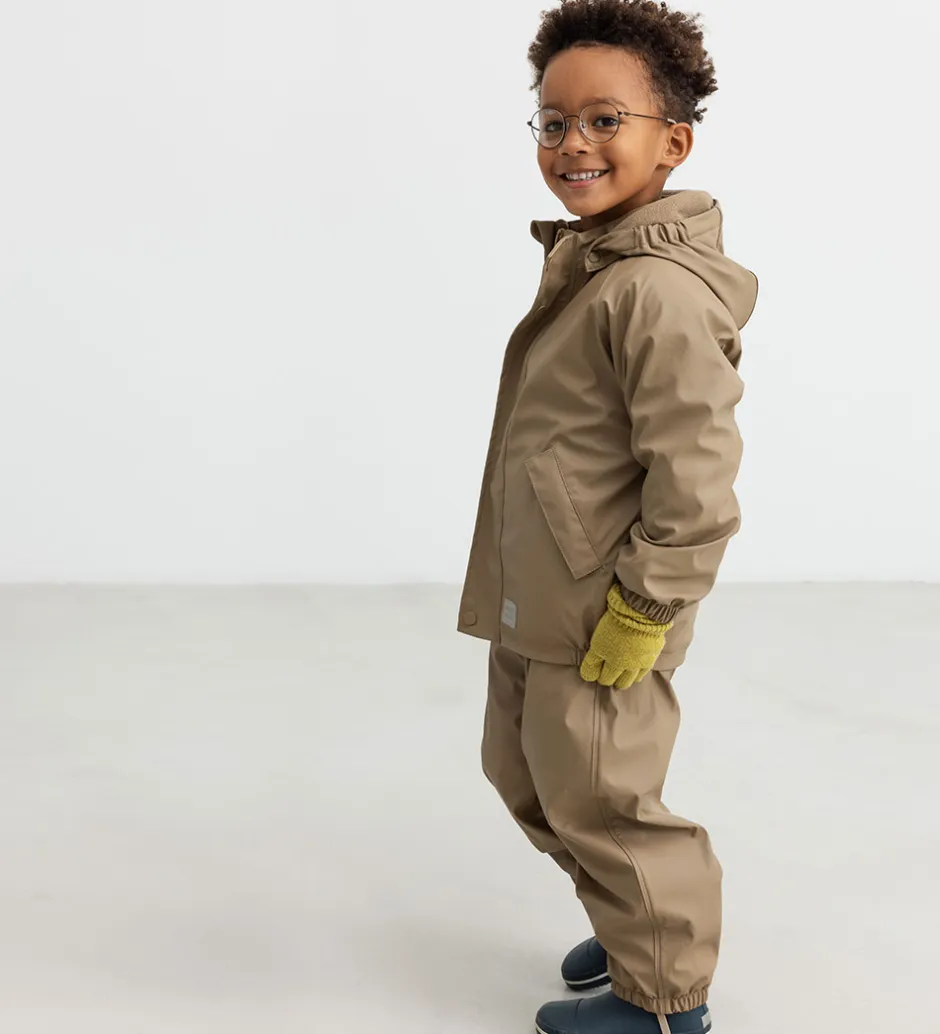 Lækkert MarMar regntøj i ensfarvet brunt PU. Regntøjet består af en regnjakke og et par regnbukser med seler.