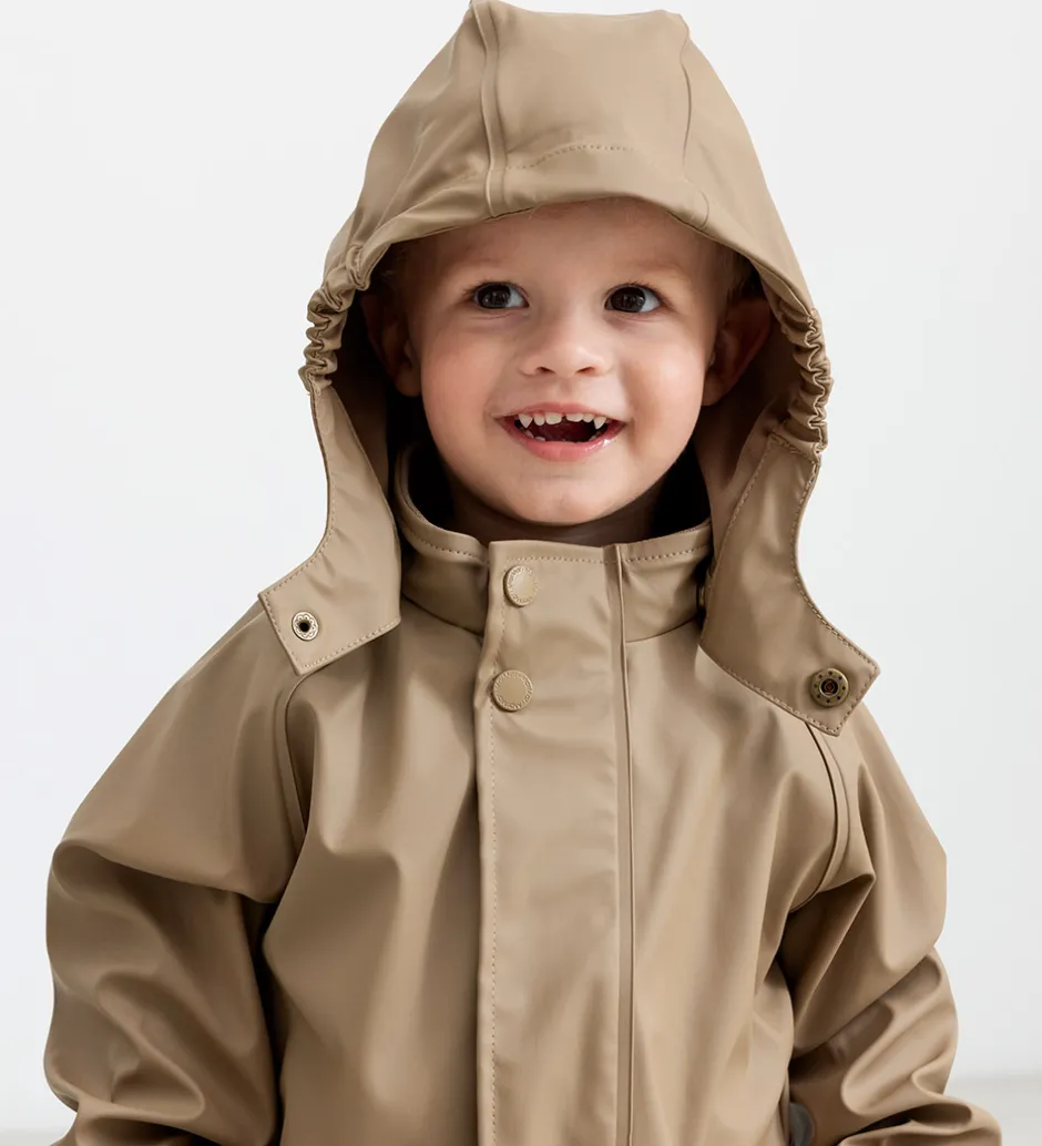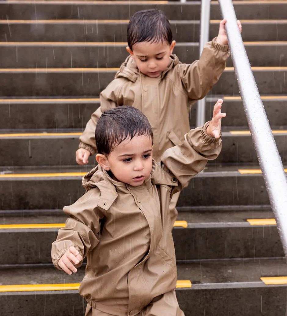 Lækkert MarMar regntøj i ensfarvet brunt PU, og det består af en regnjakke og et par regnbukser med seler.