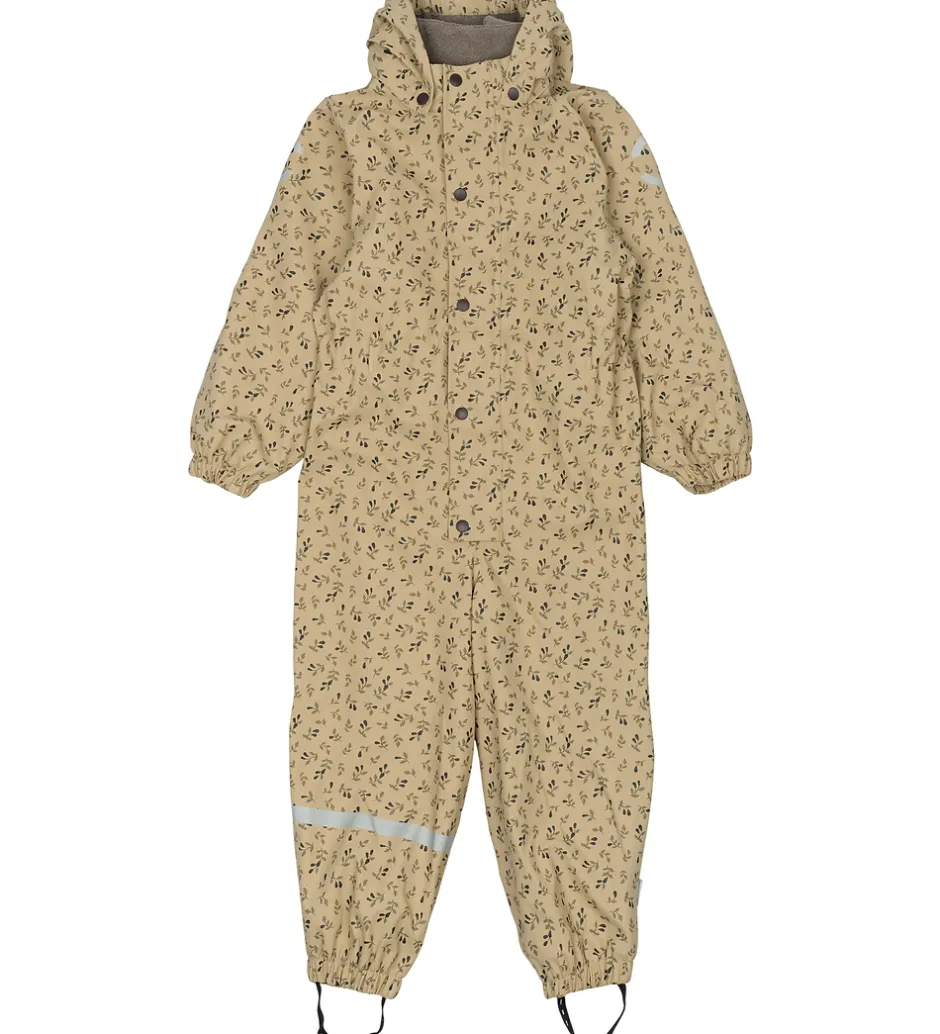 Lækker Mikk-Line regndragt i beigefarvet PU med et print med blade i grønne nuancer.