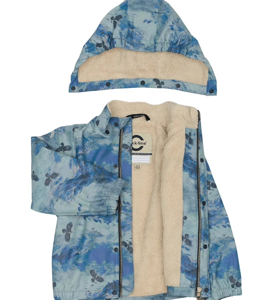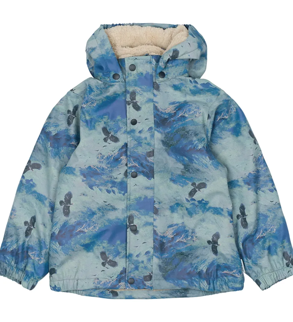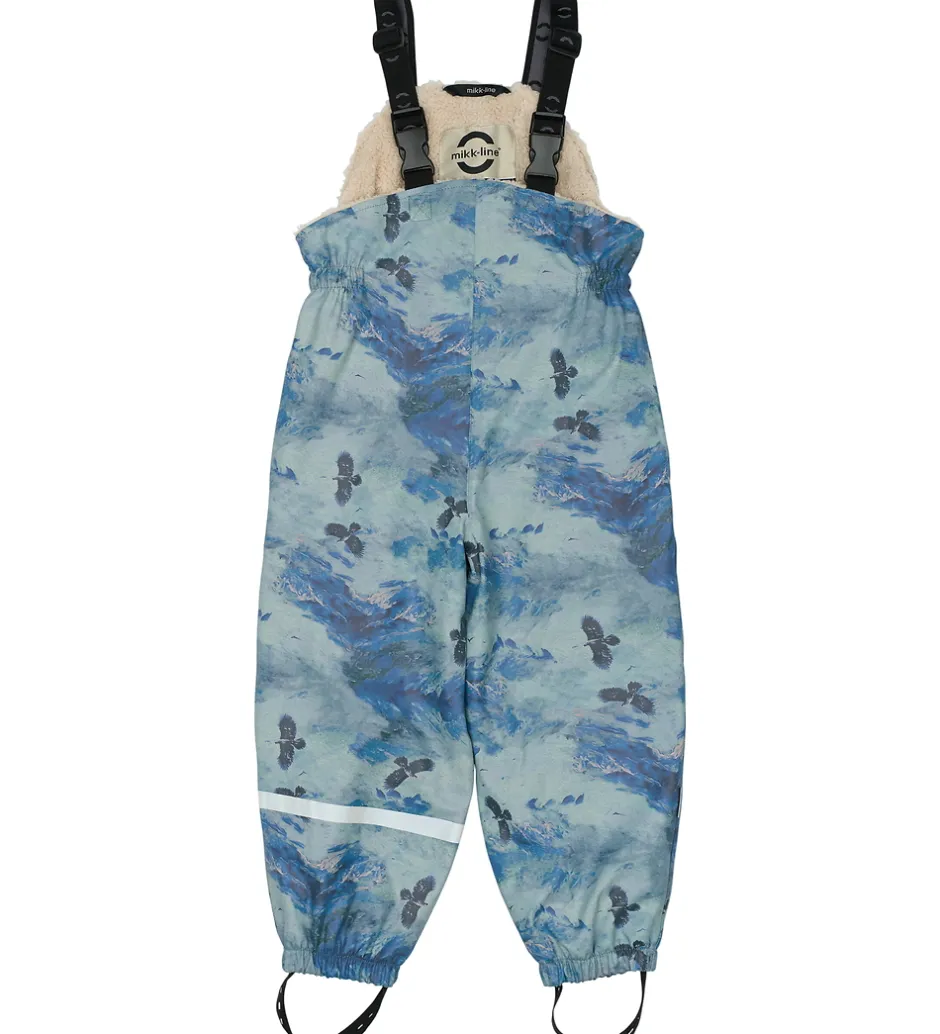 Smart Mikk-Line regntøj, der består af en regnjakke og et par regnbukser i PU med et alloverprint med sneklædte bjerge i blå nuancer og med flyvende ørne.
