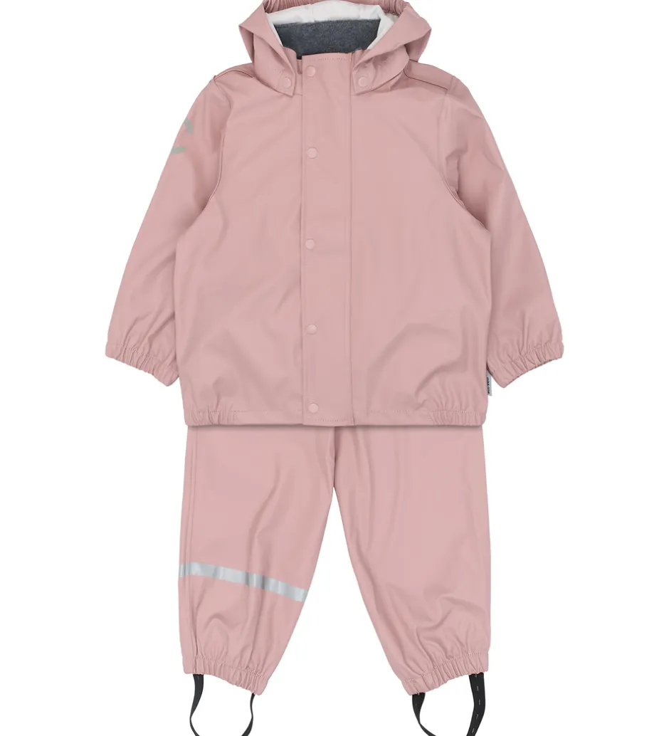 Fint Mikk-Line regntøj bestående af en regnjakke og et par regnbukser i ensfarvet, rosa PU.