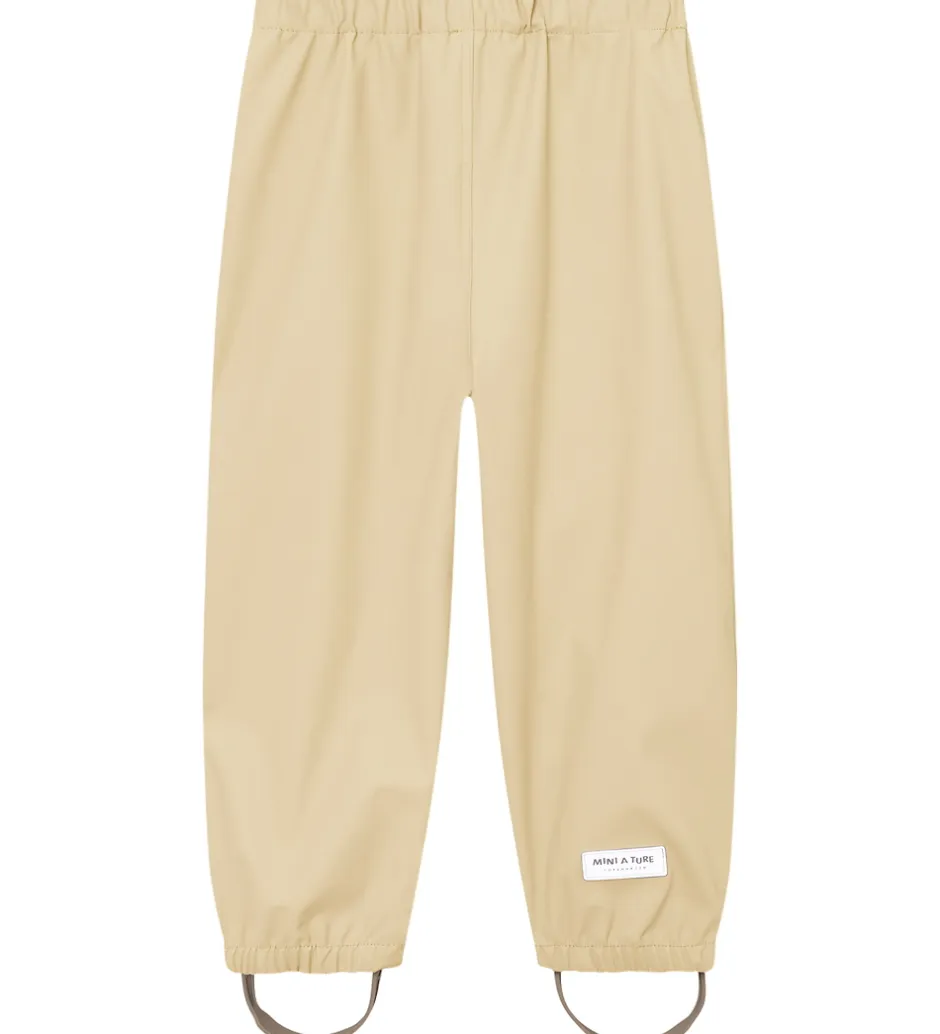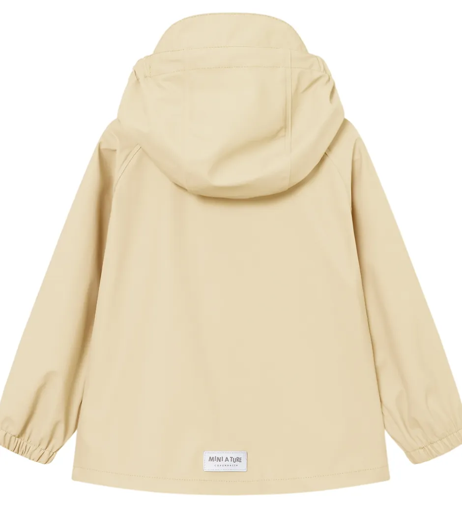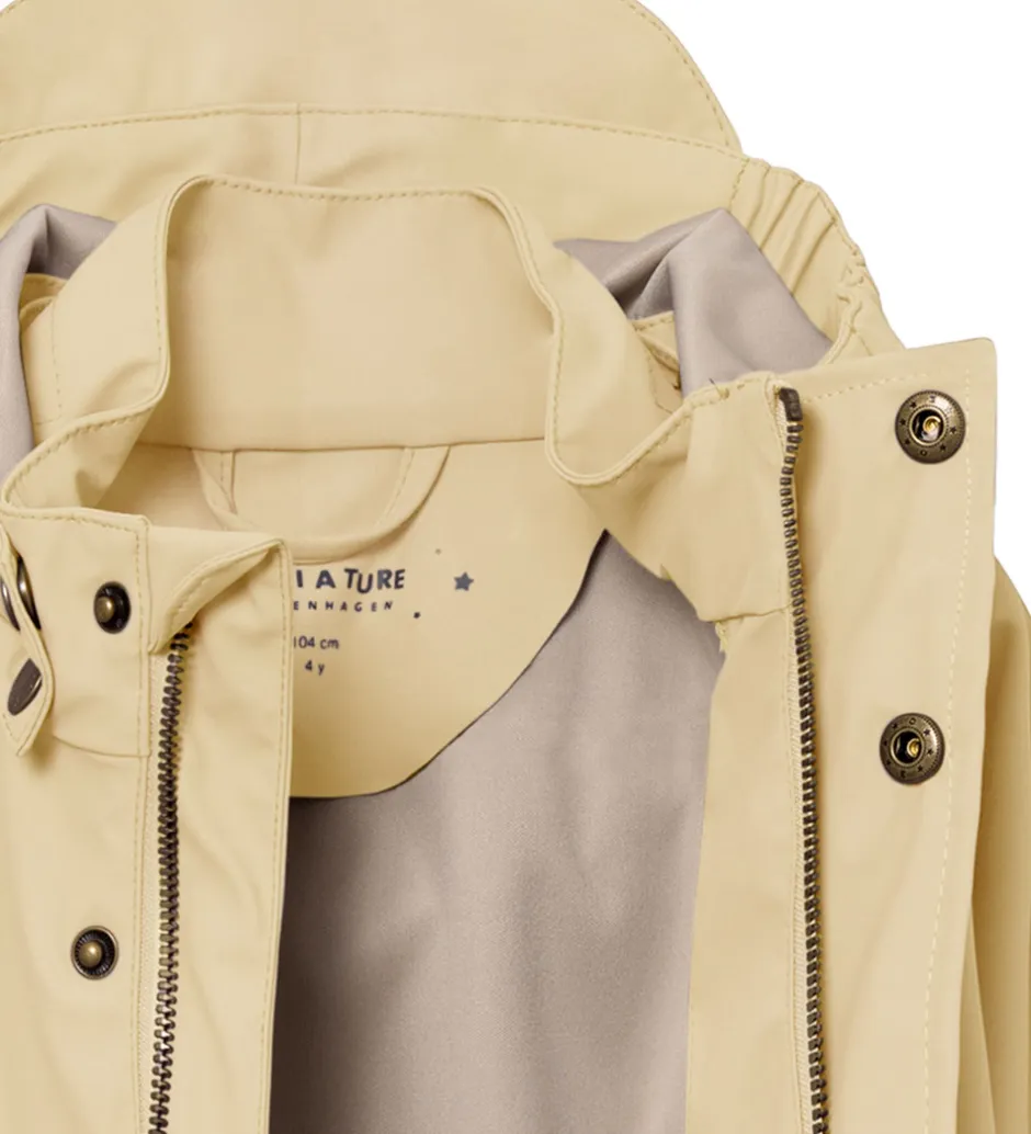 Fint Mini A Ture regntøj bestående af en regnjakke og et par regnbukser i ensfarvet lys beige PU.