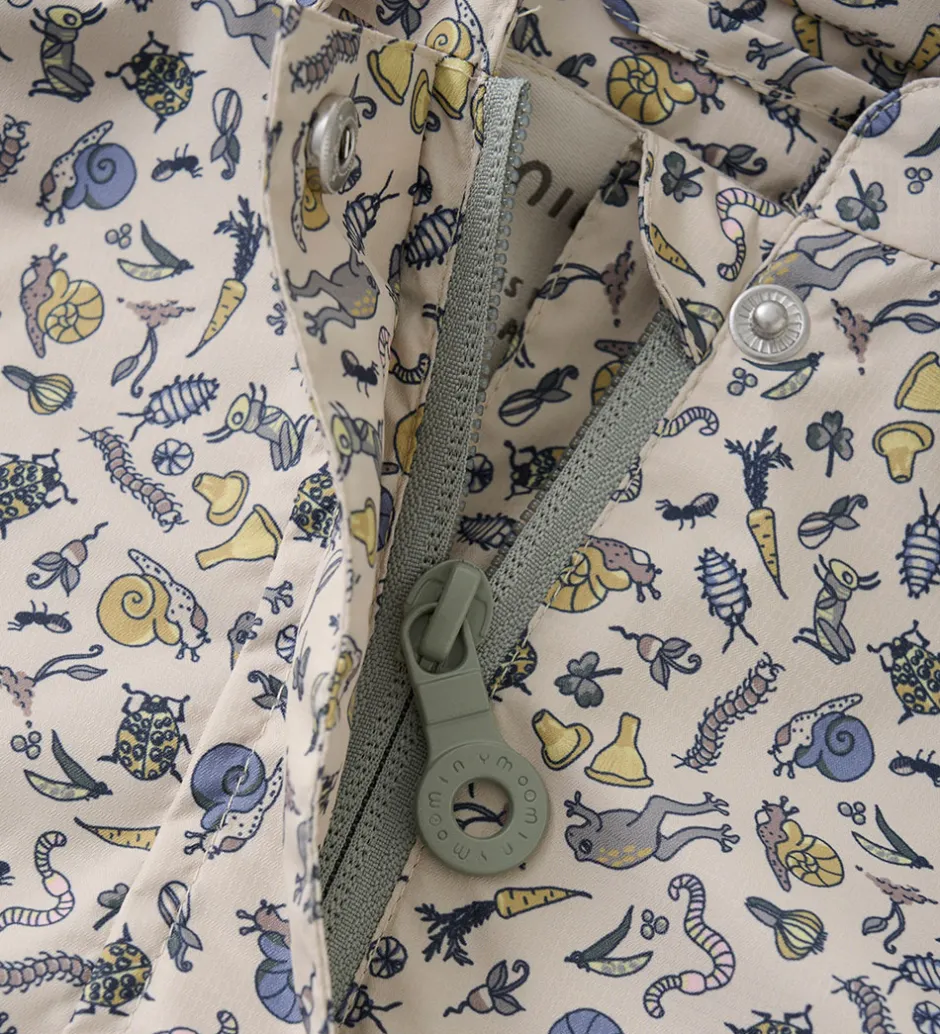 Sej Minymo regnjakke i en varm, grå nuance med alloverprint af smådyr og planter i grønne, blå og gule nuancer. Regnjakken er i en lækker PE-kvalitet.