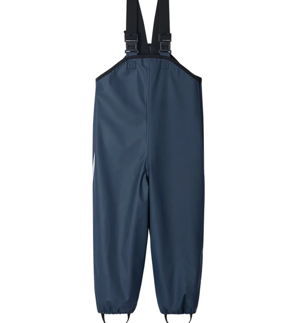 Flotte Reima regnbukser med seler i navyblå og praktiske reflekskanter ned langs siderne.