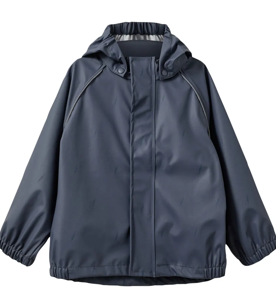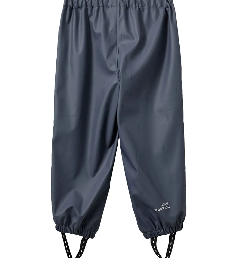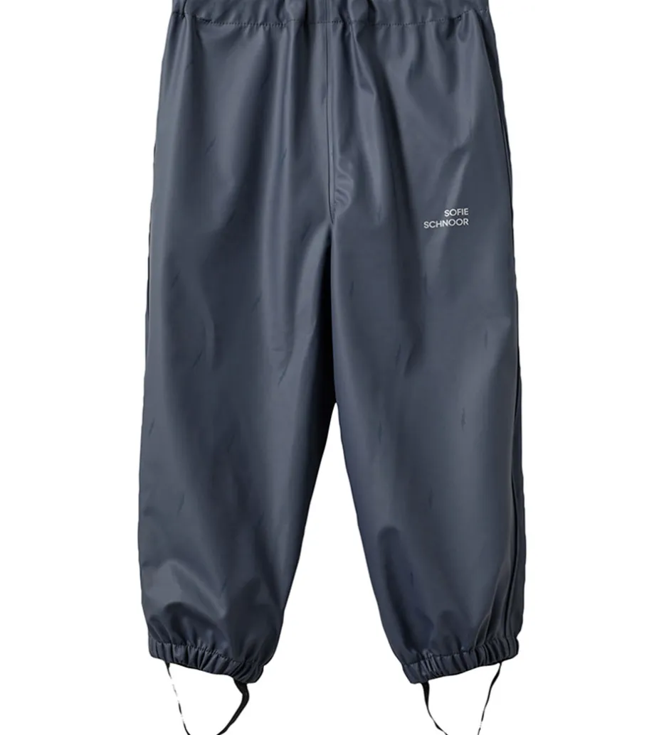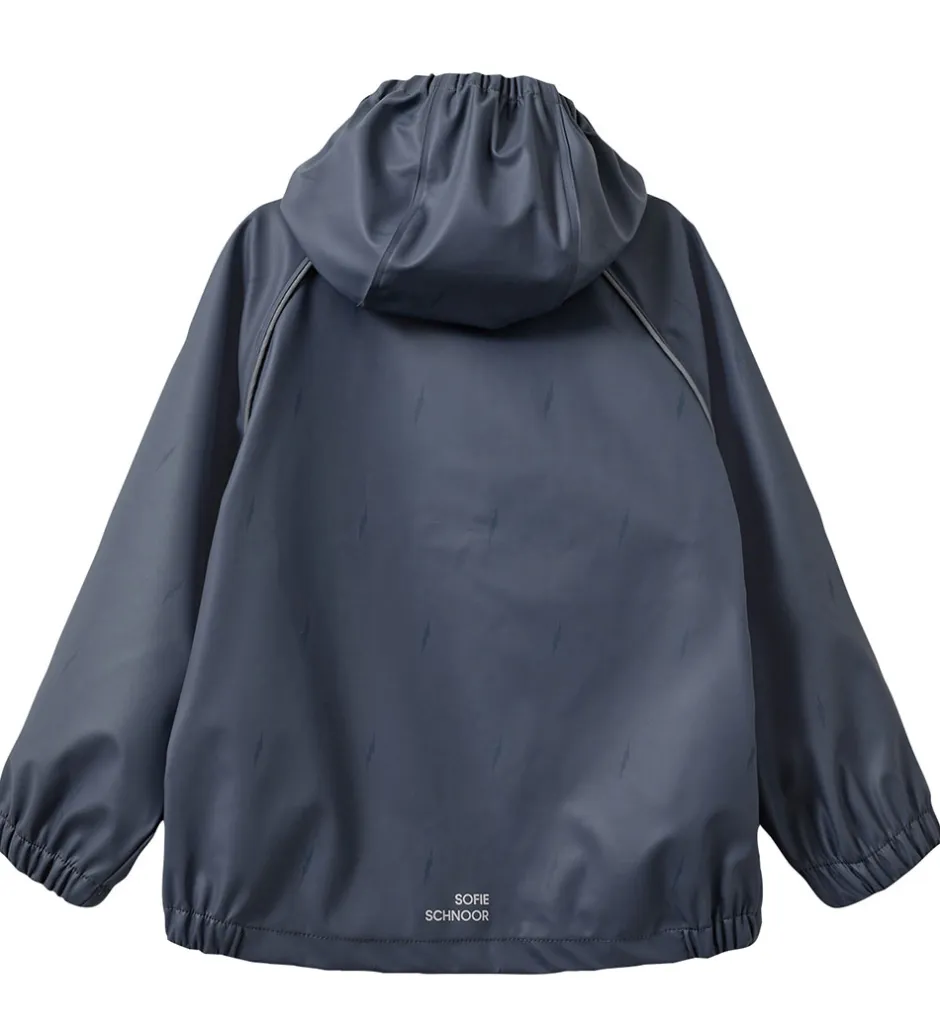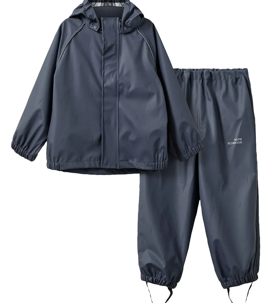 Fint Sofie Schnoor regntøj bestående af et par regnbukser og en regnjakke af PU i navylå. Regntøjet er udstyret med reflekspipings og -logoprint.