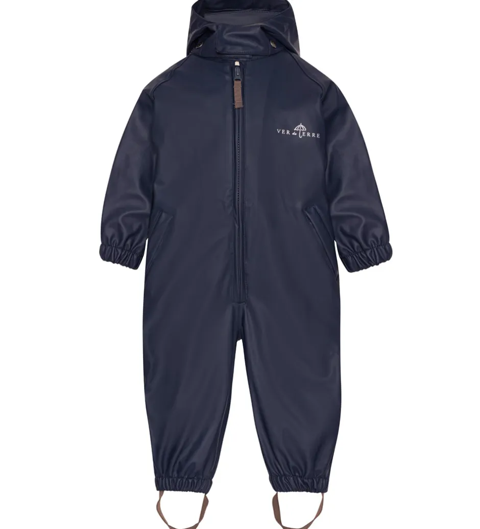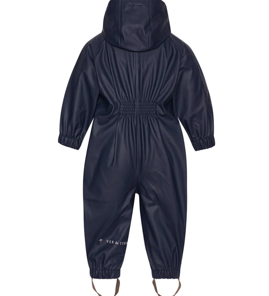 Ver de Terre regndragten har en aftagelig hætte, som sidder fast med sølvfarvede trykknapper, og den lukkes foran hagen med velcro. Ærmerne og buksebenene har brede elastikkanter, og buksebenene har praktiske elastikstropper til at sætte under gummistøvlerne.