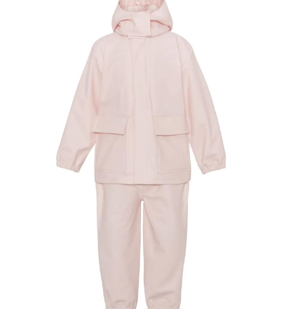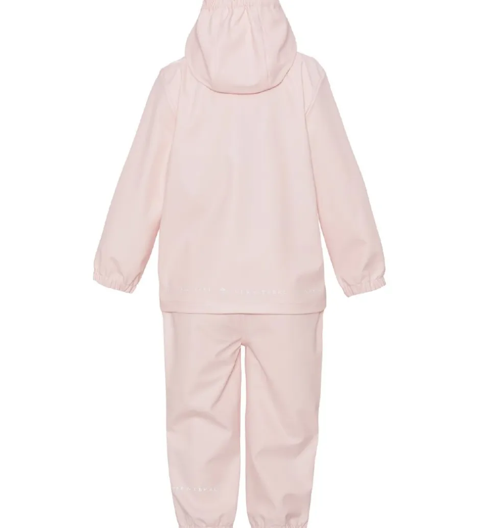 Flot Ver de Terre regntøj bestående af en regnjakke og et par regnbukser i ensfarvet pudderrosa.