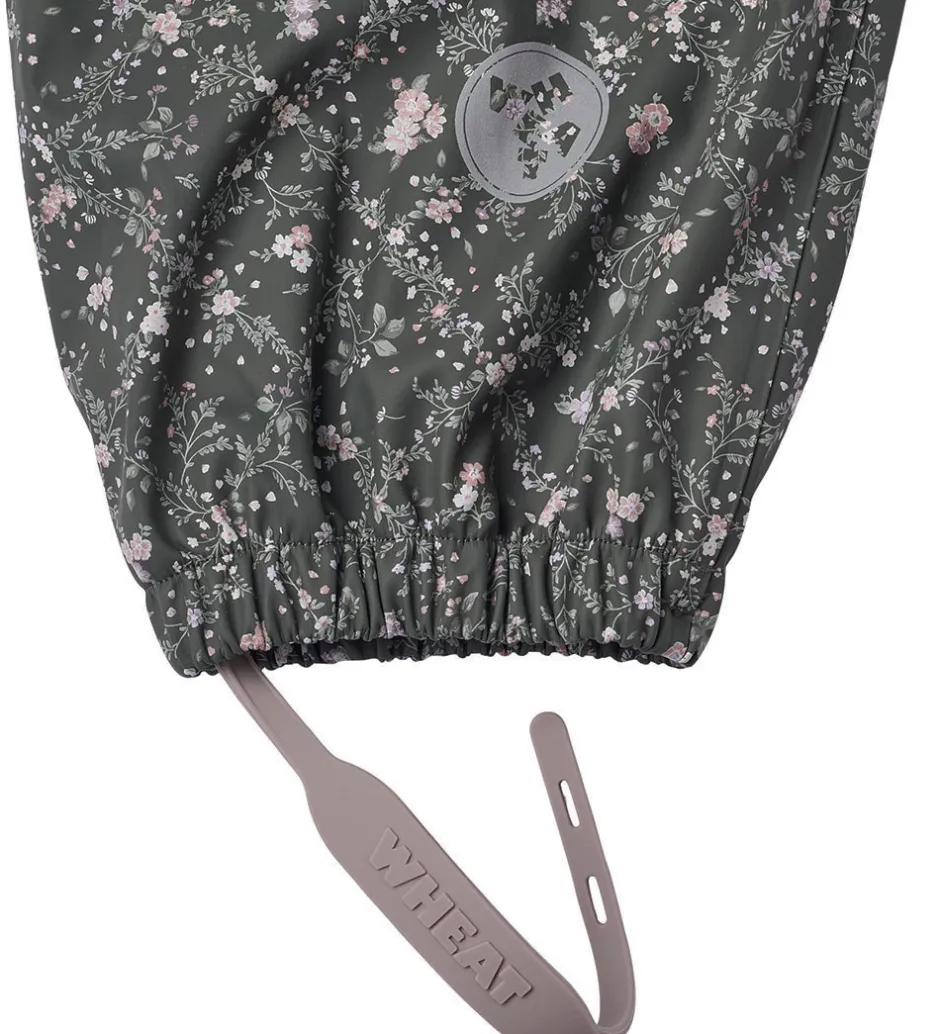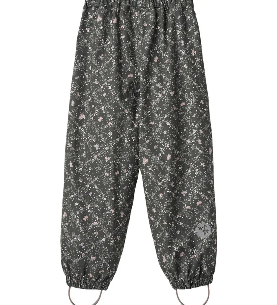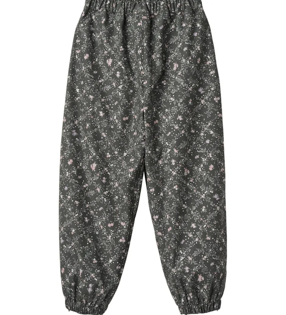 Fine Wheat regnbukser af PU i mørk koksgrå med et småblomstret alloverprint i lilla, rosa og grønne nuancer.