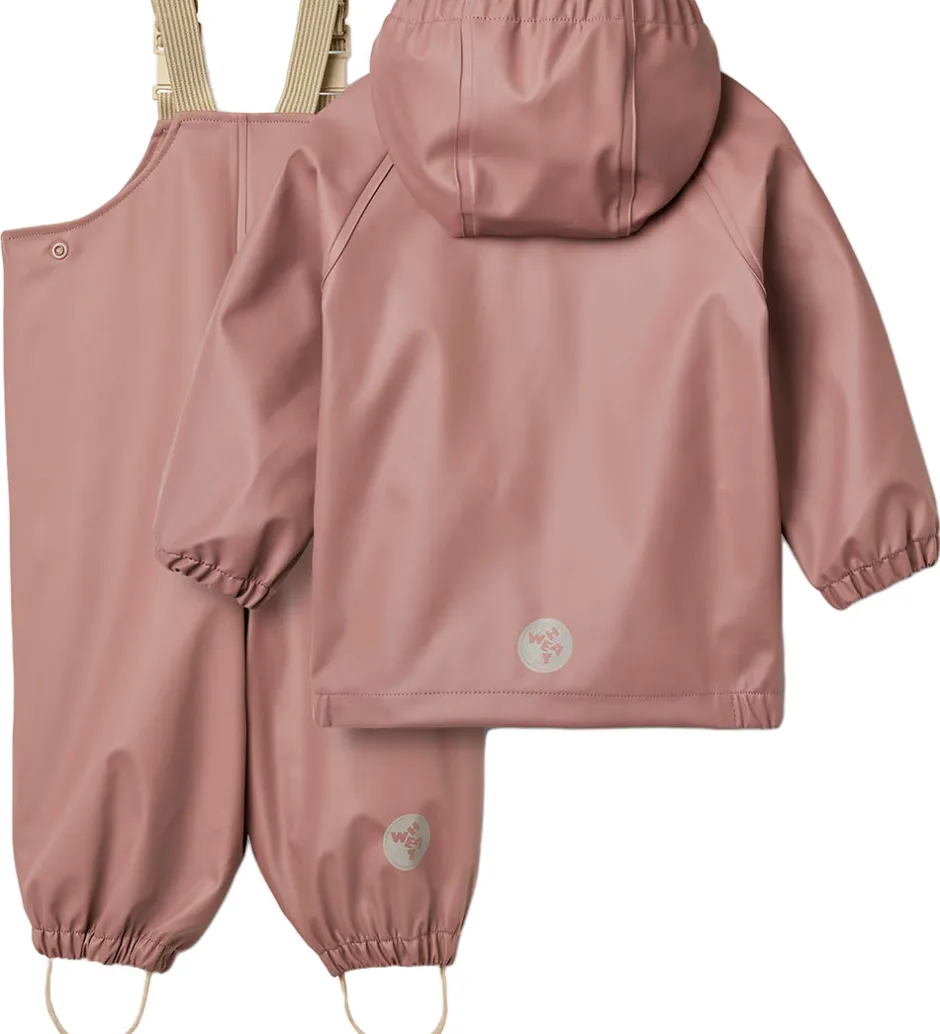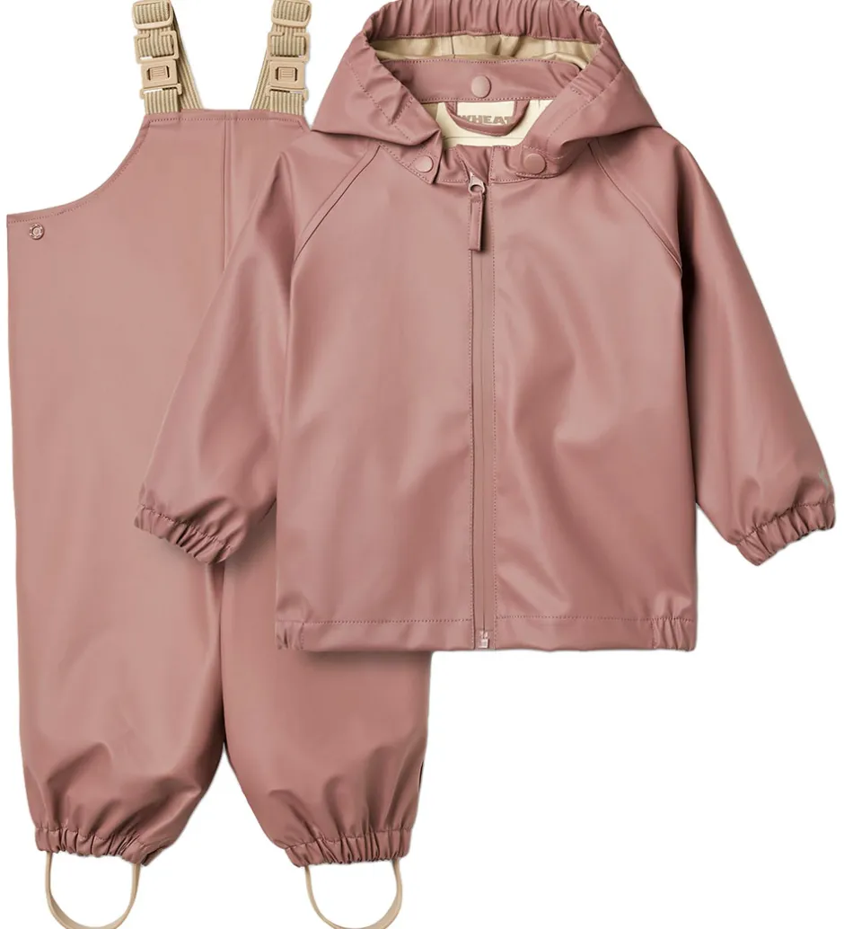 Skønt Wheat regntøj af PU i støvet lilla. Regntøjet består af en regnjakke og et par regnbukser med seler.