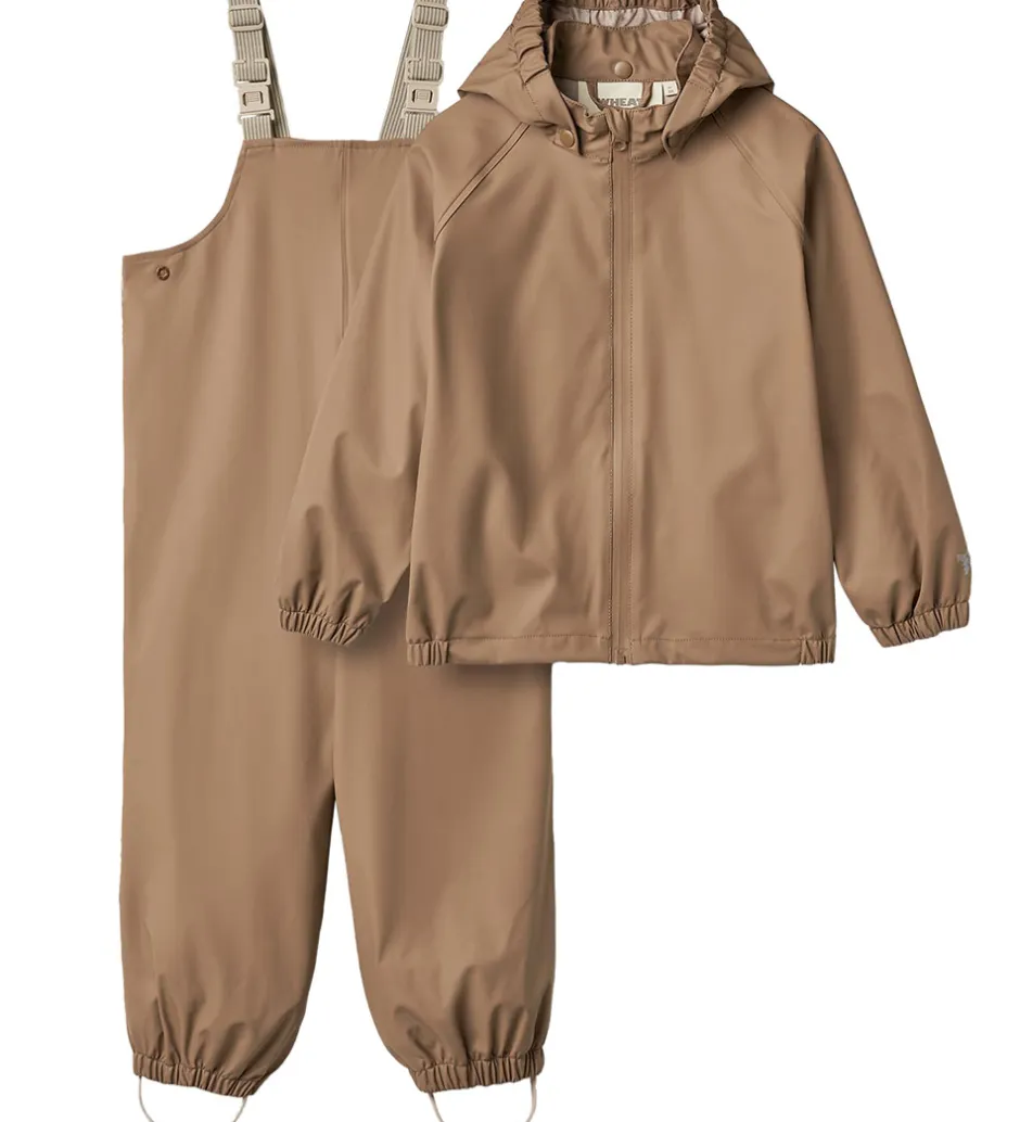 Dejligt Wheat regntøj af PU i nøddebrun og med refleksprint. Regntøjet består af en regnjakke og et par regnbukser med seler.
