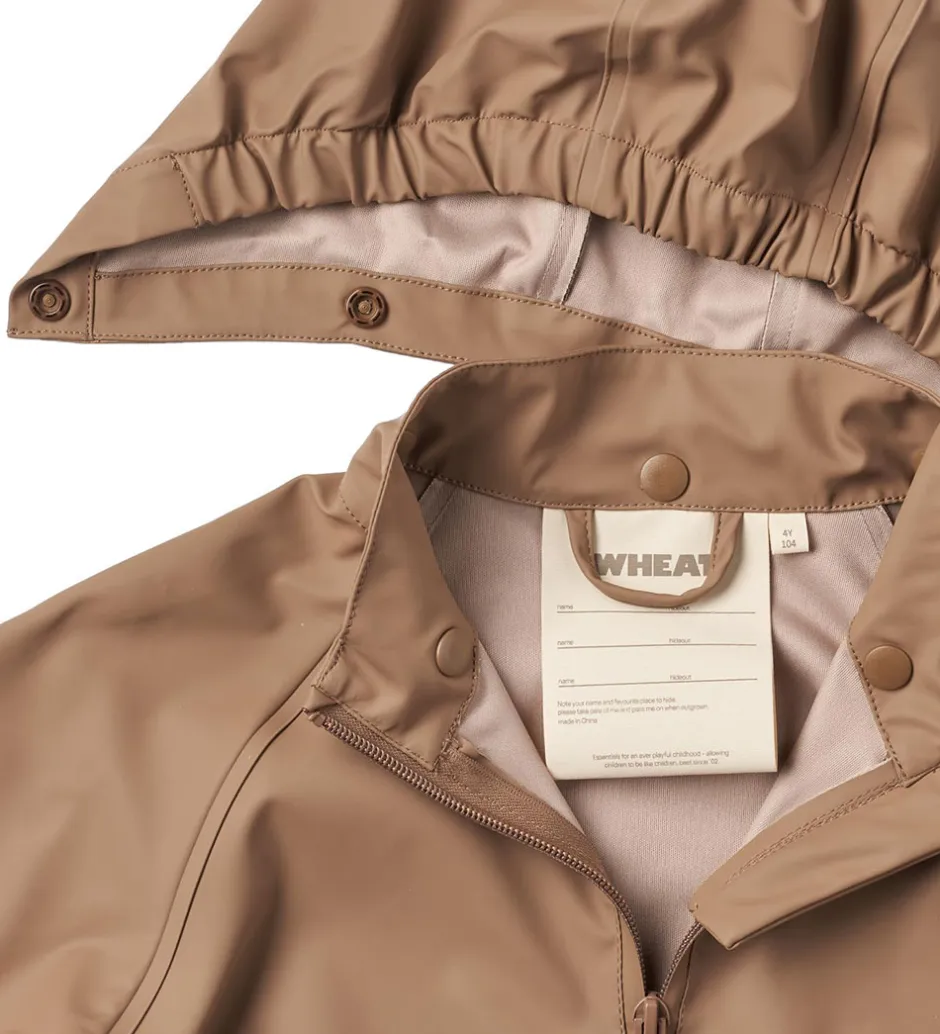 Wheat regnjakken har en aftagelig hætte, som sidder fast med trykknapper, og den kan justeres i toppen med velcro. Ærmerne har smalle elastikkanter, og i bunden har jakken elastikkant i siderne. Regnjakken åbnes med en lynlås med gummilukning og hagebeskytter, og i siderne er der praktiske, åbne lommer.