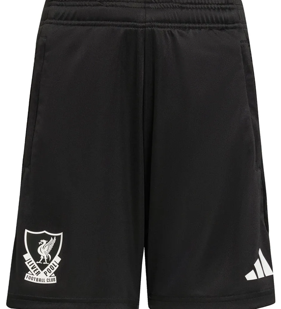 Smarte adidas Performance shorts i sort med hvide og grønne detaljer, og nederst på højre bukseben sidder der et logo for den engelske foboldklub Liverpool FC. Shortsene er inspireret af holdets ungdomshold i sæsonen 25/26.