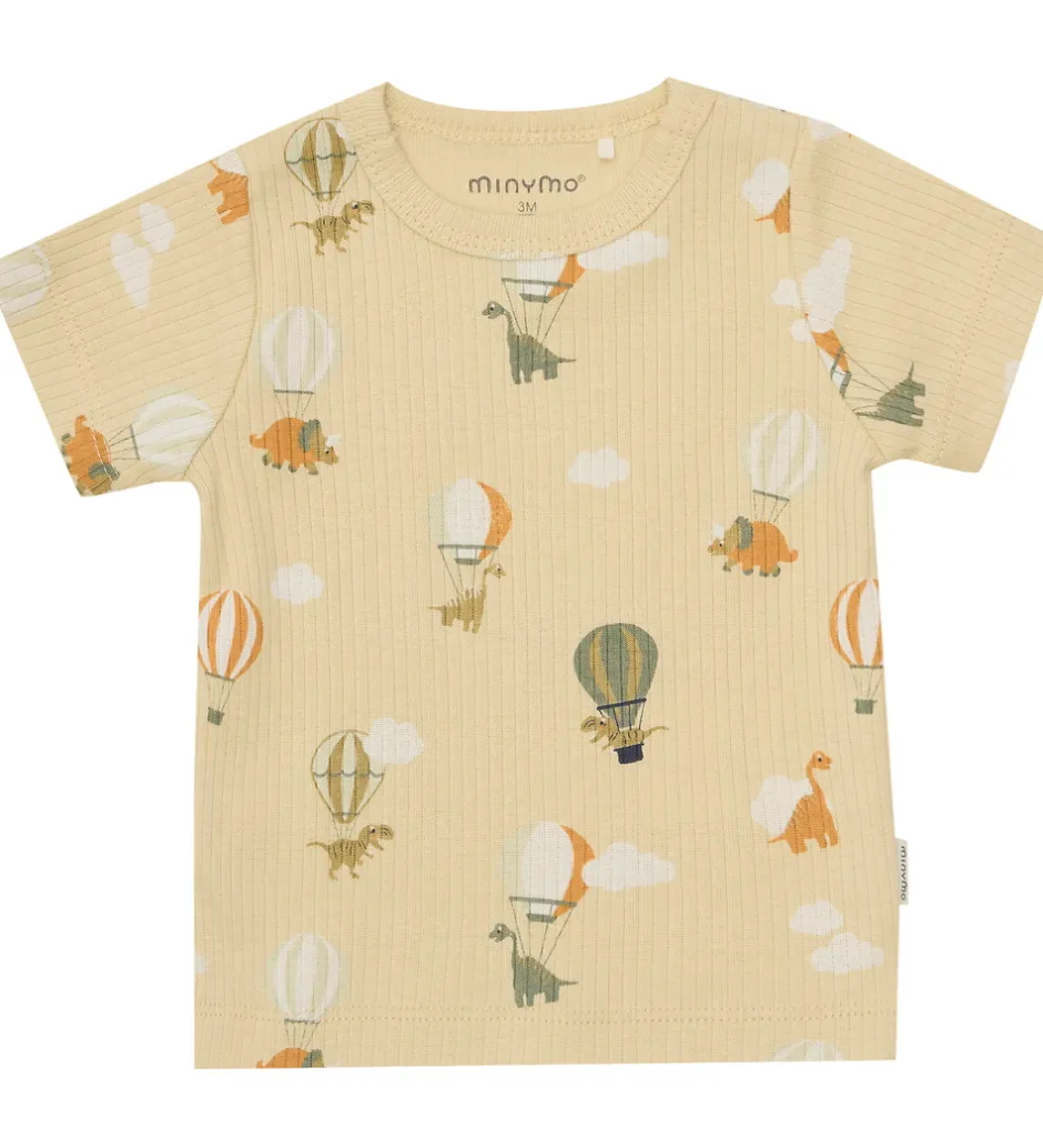 Skøn Minymo shortssæt bestående af en t-shirt og et par shorts i beige med et fint alloverprint af dinosaurer i luftballoner.