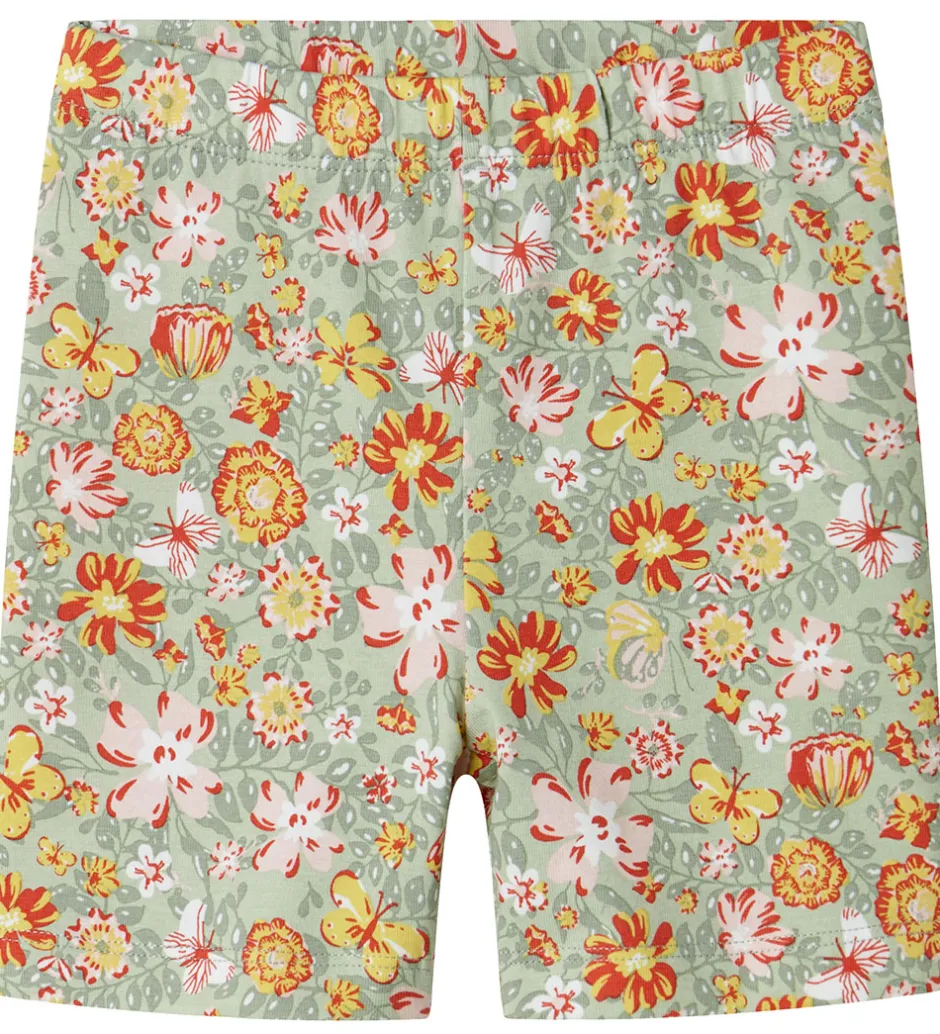 Farverige Name It cykelshorts med et livligt blomster- og sommerfugleprint i røde, gule og hvide nuancer mod en støvet grøn baggrund. Shortsene har en elastisk talje, der sikrer en god pasform.