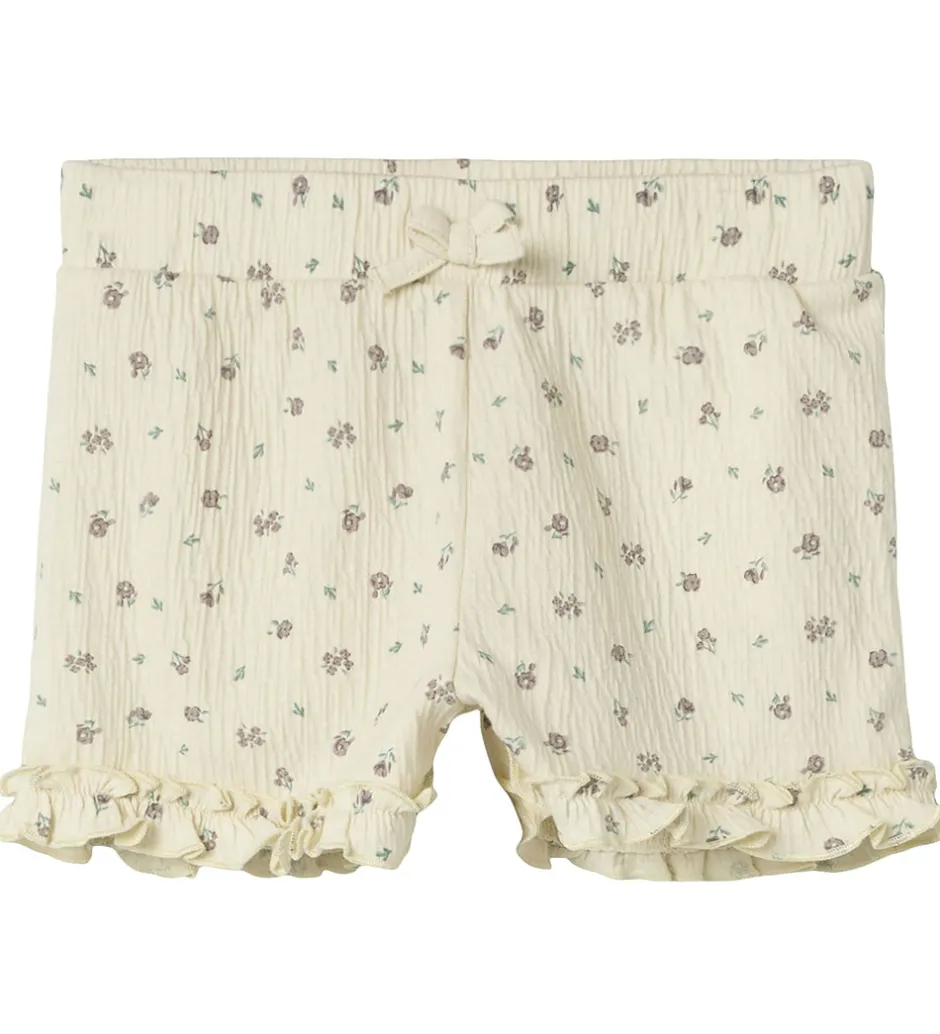 Charmerende Name It shorts i en lys, beige nuance med et fint blomsterprint og en lækker struktur i stoffet. Name It shortsene har en behagelig pasform med elastisk talje og flotte flæsedetaljer ved buksebenene.
