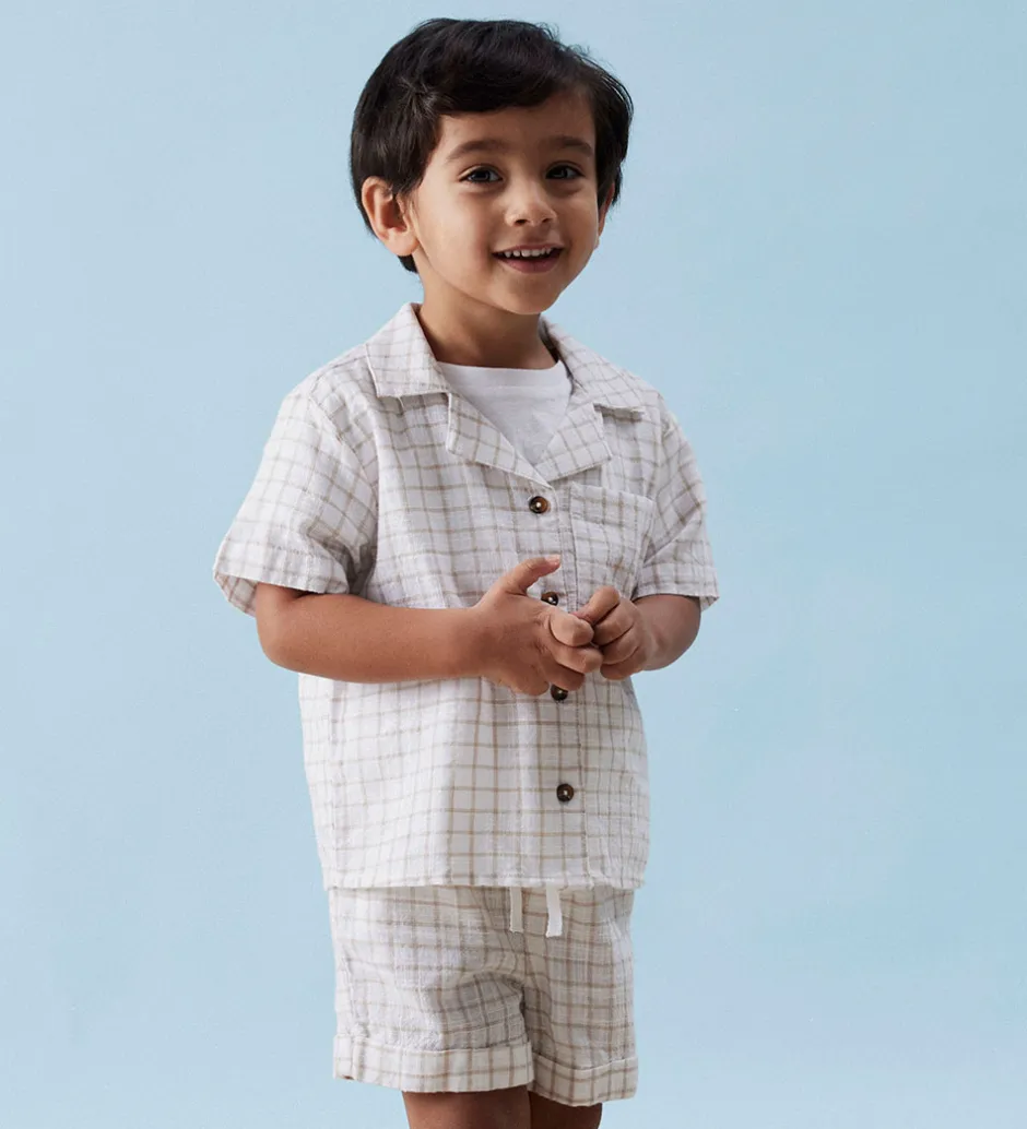 Stilfulde Name It shorts i hvid med et tidløst ternet mønster i beige. Shortsene er designet med en let struktur og et fastsyet ombuk i benåbningerne, som giver et moderne og afslappet look.