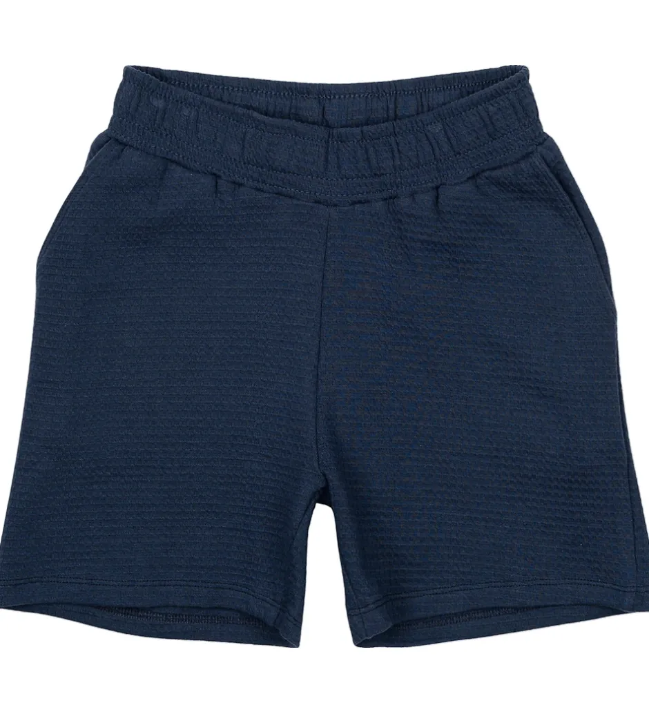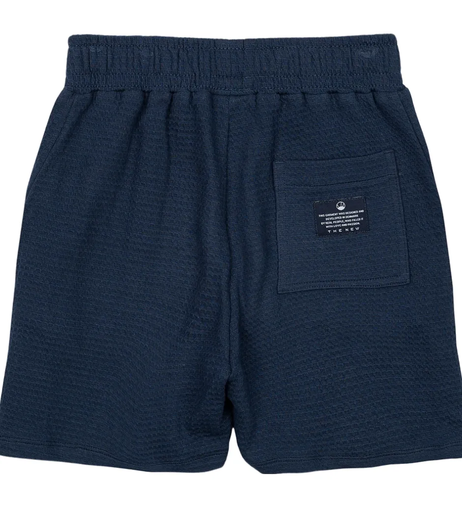 Smarte The New shorts i ensfarvet navyblå med vaflet struktur. The New shortsene har en elastisk talje, som kan justeres med knapper indvendigt. I siderne er der praktiske lommer og bagtil er der en firkantet lomme i højre side.