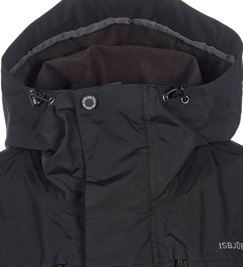 Isbjörn Of Sweden skaljakken har en fast hætte med en høj hals. Hætten har en skygge øverst i ansigtsåbningen og elastikkanter i siderne, og den kan justeres med spænder. Hætten er foret med fint fleece.