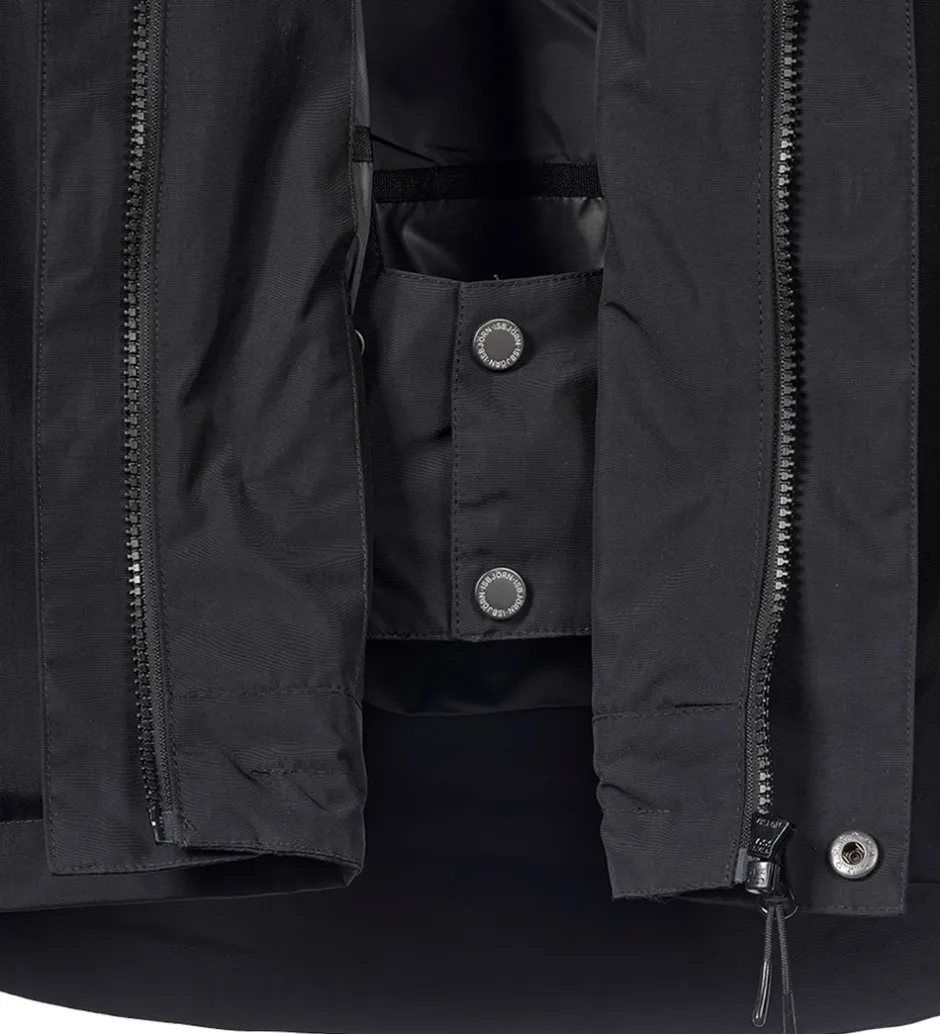 Skaljakken har to vertikale brystlommer med lynlåslukninger samt en skjult lynlåslomme i venstre ærme. Omkring livet er der et elastisk snefang, som har en gummibelægning på indersiden. Snefanget åbnes og lukkes med trykknapper fortil, og når snefanget ikke er i brug, kan det fæstnes til foret med en trykknap. I selve livåbningen har vinterjakken en indvendigt justerbar elastikkant.