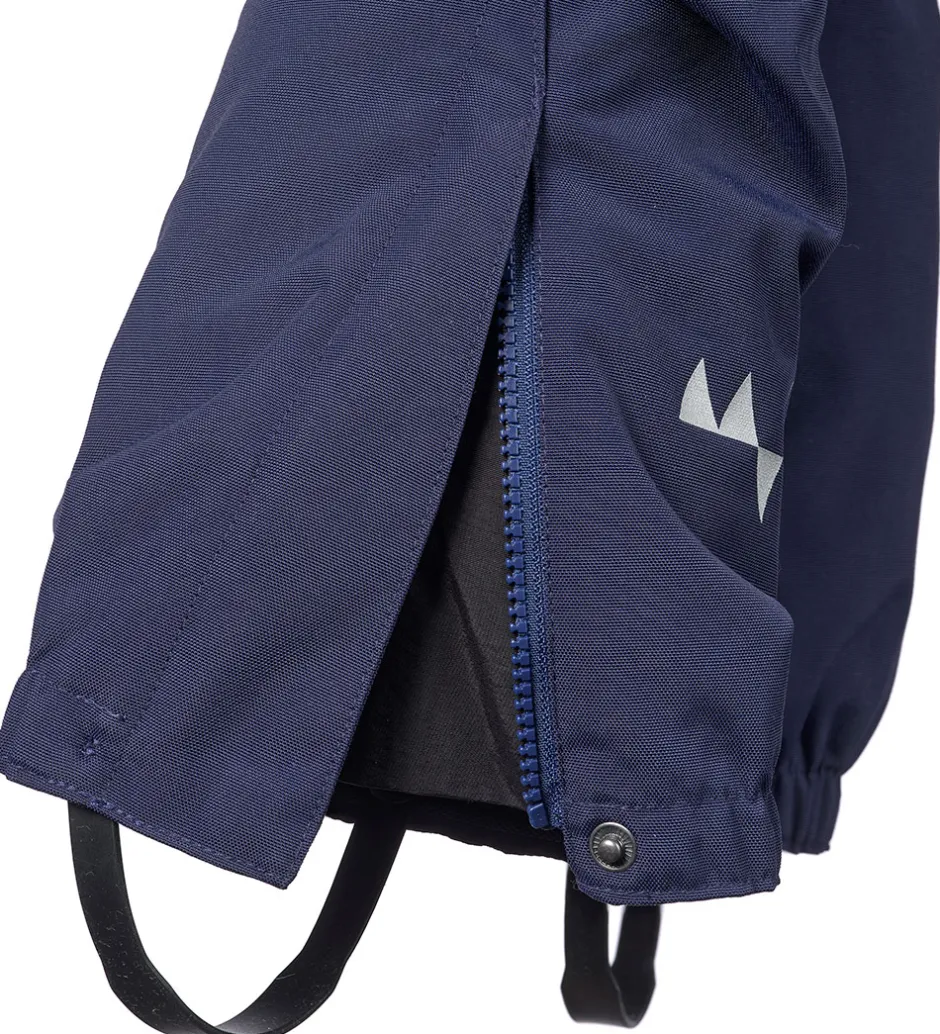 Isbjörn Of Sweden skalbukserne åbnes fortil med to trykknapper og en lynlås i livet. I benåbningerne har de elastikkanter med indvendig gummibelægning. Der er også aftagelige, justerbare støvlestropper i gummi, som der medfølger én ekstra af. Benåbningerne kan i øvrigt løsnes op ved hjælp af en lynlås på ydersiden. Når lynlåsen er lukket, sikres den med en trykknap.