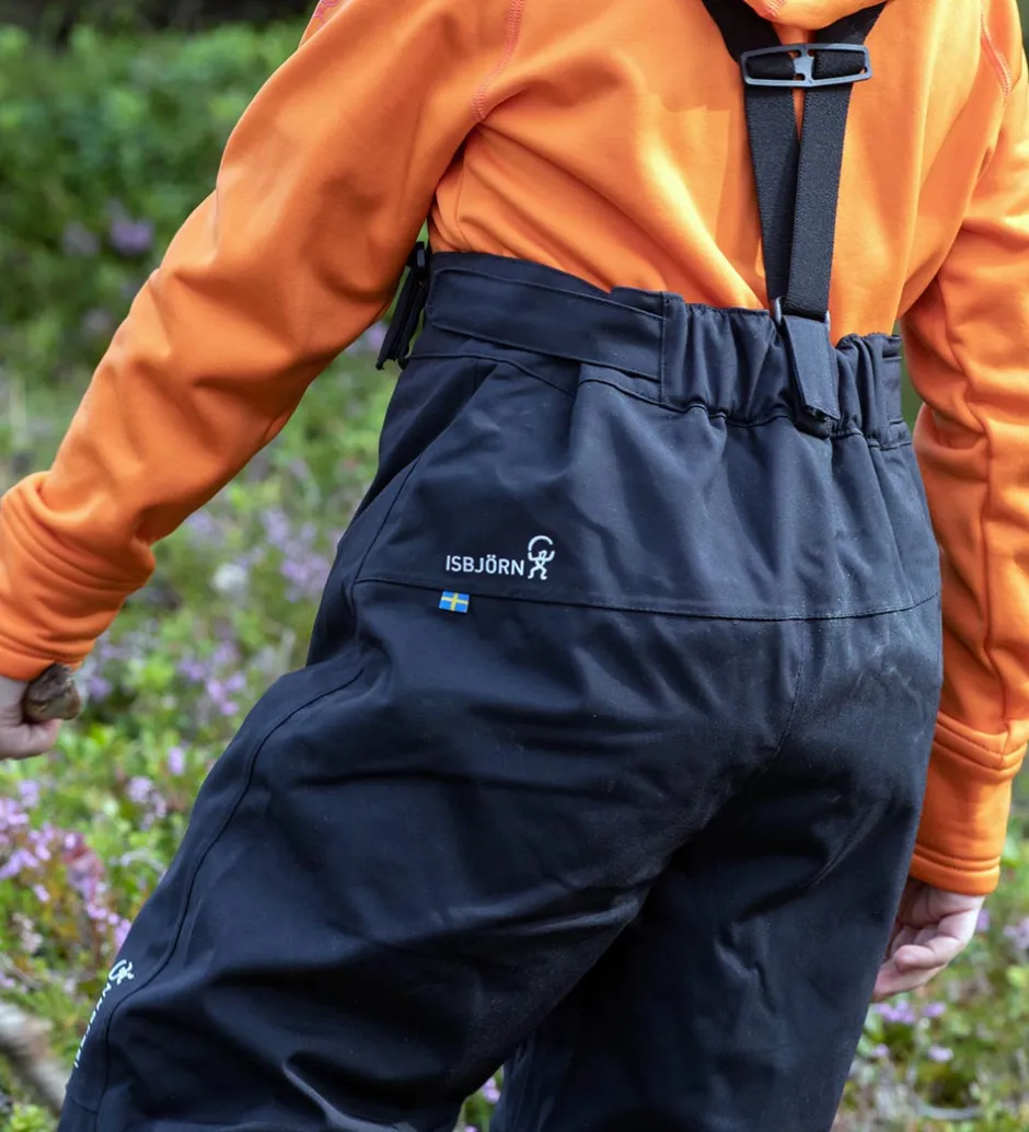 Isbjörn Of Sweden skalbuksene har smarte, justerbare seler, som samles på ryggen. Selerne sidder fast med velcroremme i livåbningen, så de kan tages af. hvis det ønskes. Livåbningen har en elastikkant bagtil og kan desuden justeres ind ved hjælp af velcroremme i siderne.